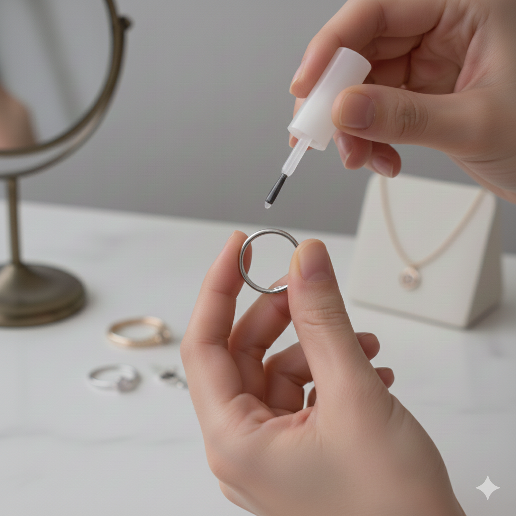Sơn móng tay trong suốt có thể tạo ra một lớp “đệm” mỏng bên trong lòng nhẫn, giúp thu nhỏ chu vi nhẫn theo ý muốn. Đây là mẹo được nhiều người áp dụng vì dễ làm và ít tốn kém.