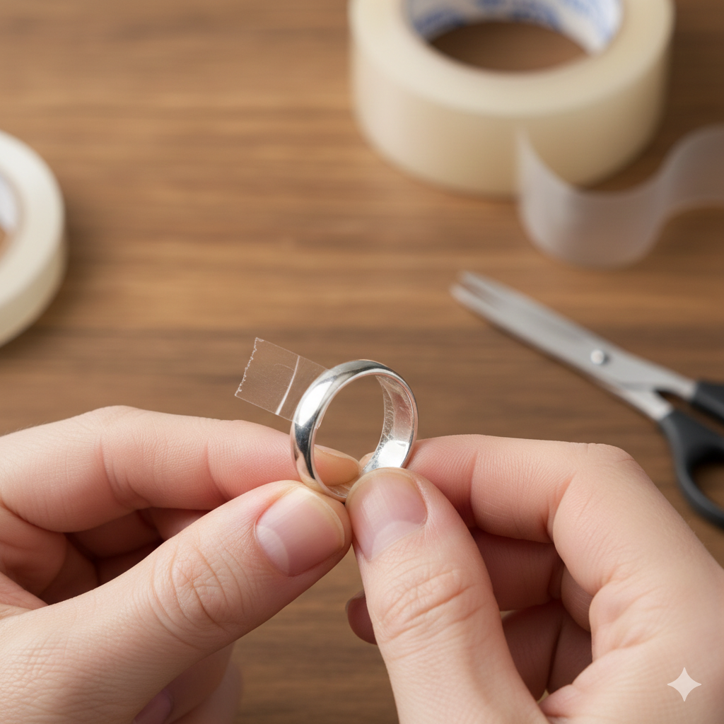 Băng keo trong suốt có thể quấn quanh đáy nhẫn để thu nhỏ chu vi, dễ làm tại nhà và phù hợp với những chiếc nhẫn bản không quá mỏng.