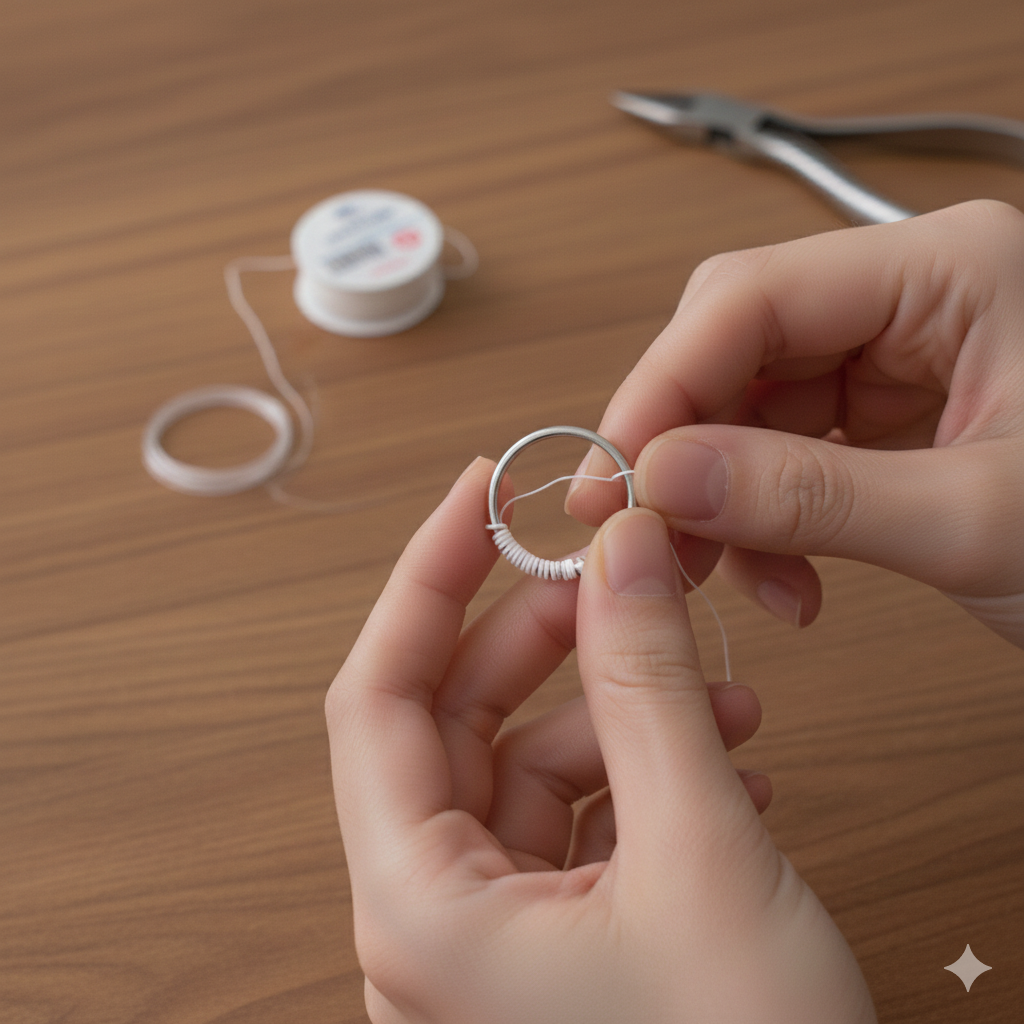 Dùng chỉ nha khoa, dây câu cá hoặc chỉ khâu quấn vào đáy nhẫn là cách thu nhỏ nhẫn nhanh – đơn giản, phù hợp cho nhẫn đeo hằng ngày dù nhìn gần không quá hoàn hảo.