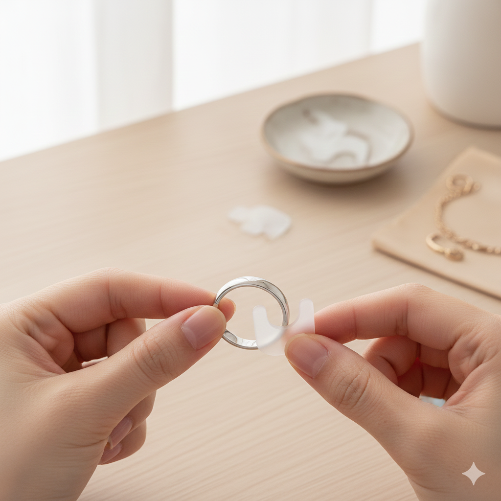 Nếu bạn muốn một cách xử lý gọn gàng, có tính thẩm mỹ ổn hơn so với dây thun hay chỉ, miếng dán điều chỉnh size nhẫn là lựa chọn đáng tham khảo. Đây là những miếng silicon hoặc xốp nhỏ được thiết kế riêng để dán vào lòng nhẫn.