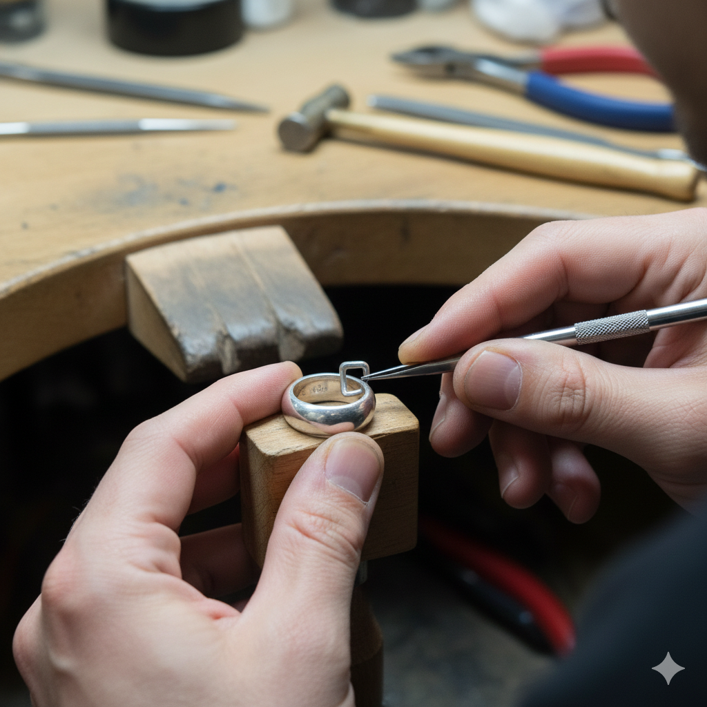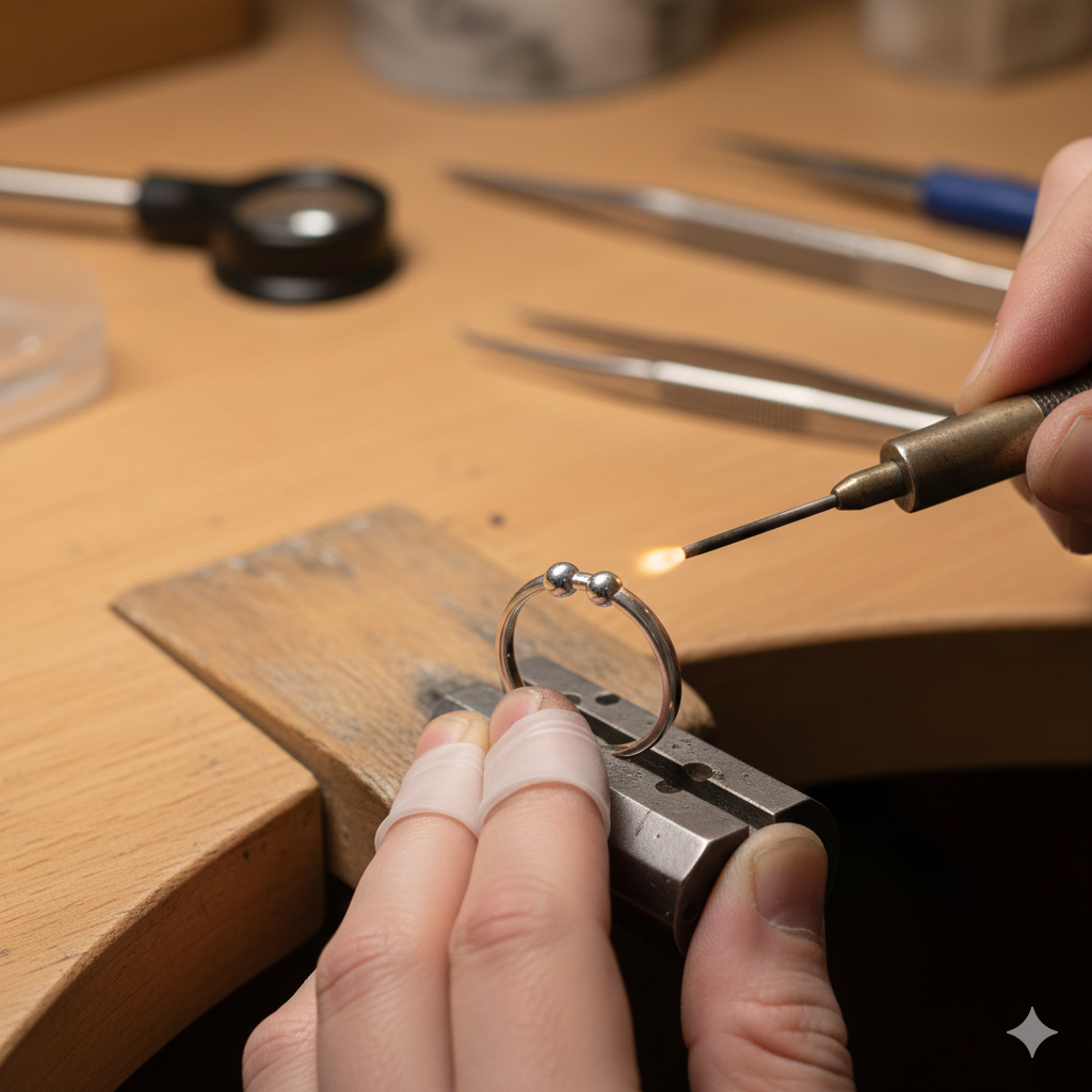 Thêm hạt định cỡ là cách thu nhỏ nhẫn kín đáo: thợ kim hoàn gắn 2–4 hạt kim loại nhỏ vào mặt trong nhẫn để giảm chu vi và giúp nhẫn cố định tốt hơn mà vẫn êm tay.