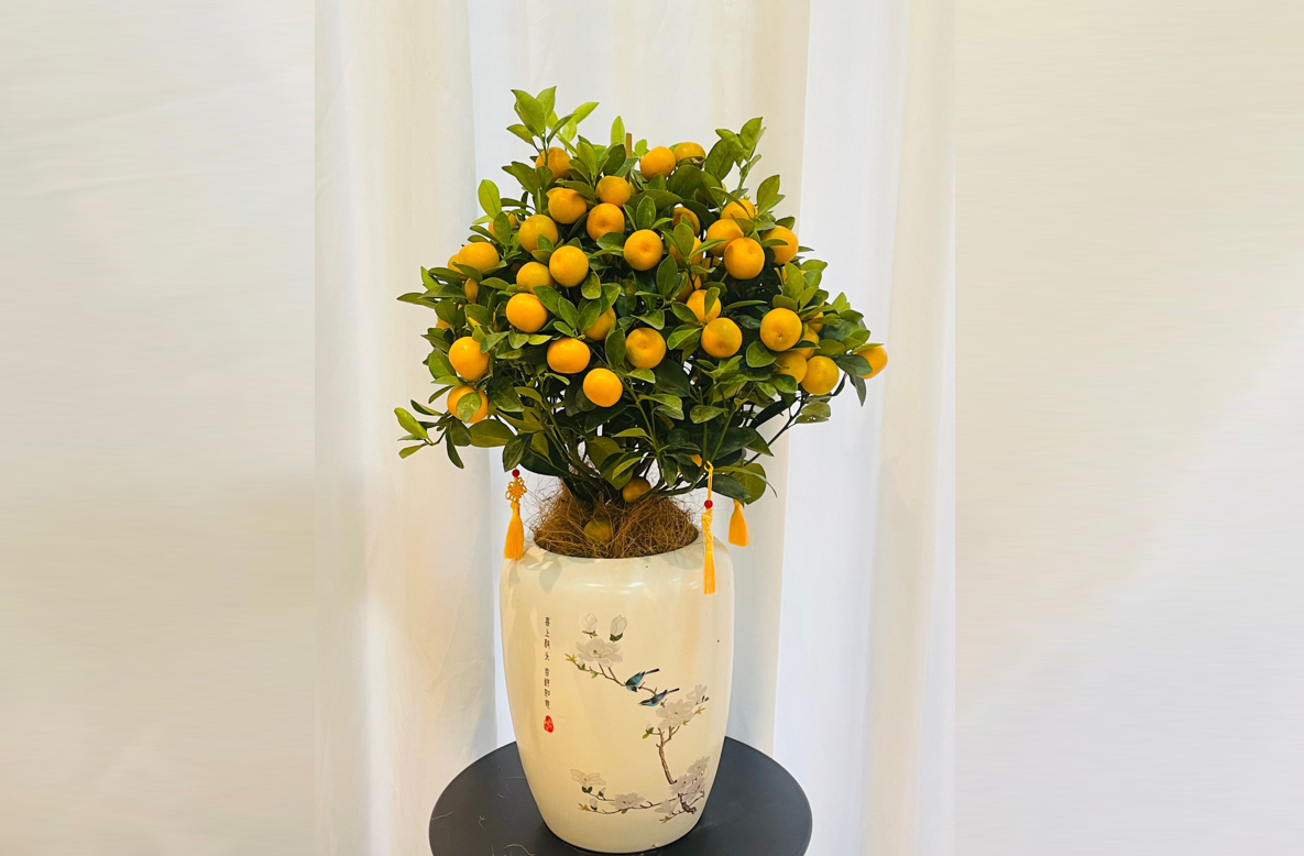 • Chọn cây tán đều, quả tròn, sai, màu vàng cam tươi → biểu trưng cho tài lộc đầy đặn