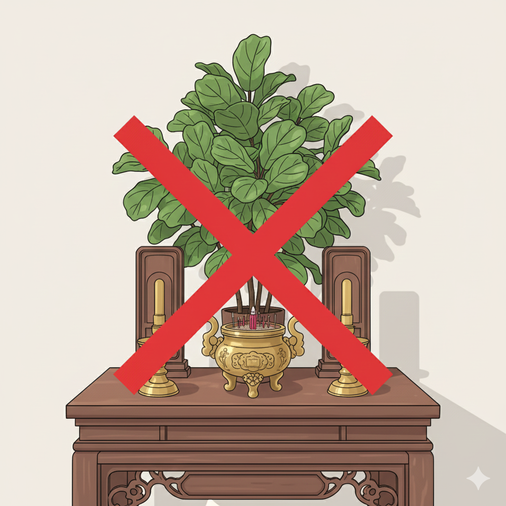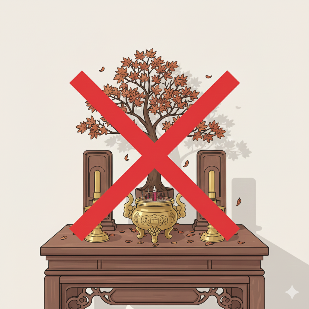 Đặt cây che khuất bát hương hoặc bài vị là kiêng kỵ lớn, vừa làm mất sự trang nghiêm vừa tiềm ẩn nguy cơ cháy.