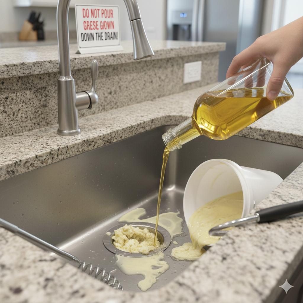 Đổ dầu mỡ nấu ăn thừa xuống bồn rửa khiến dầu đông lại, bám thành ống và gây tắc nghẽn nghiêm trọng, vì vậy nên thu gom dầu nguội và bỏ vào thùng rác.