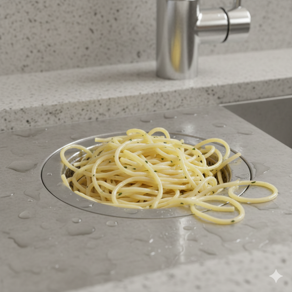 Chưa dừng lại ở đó, lớp dầu mỡ bám sẵn sẽ “giữ” lại các vụn thức ăn khác như cơm, rau, bã trà… khiến chúng mắc lại và tích tụ thành khối tắc rất cứng đầu. Đây là kiểu tắc nghẽn khó xử lý vì không nằm ngay miệng thoát mà thường hình thành sâu bên trong các đoạn cong.
