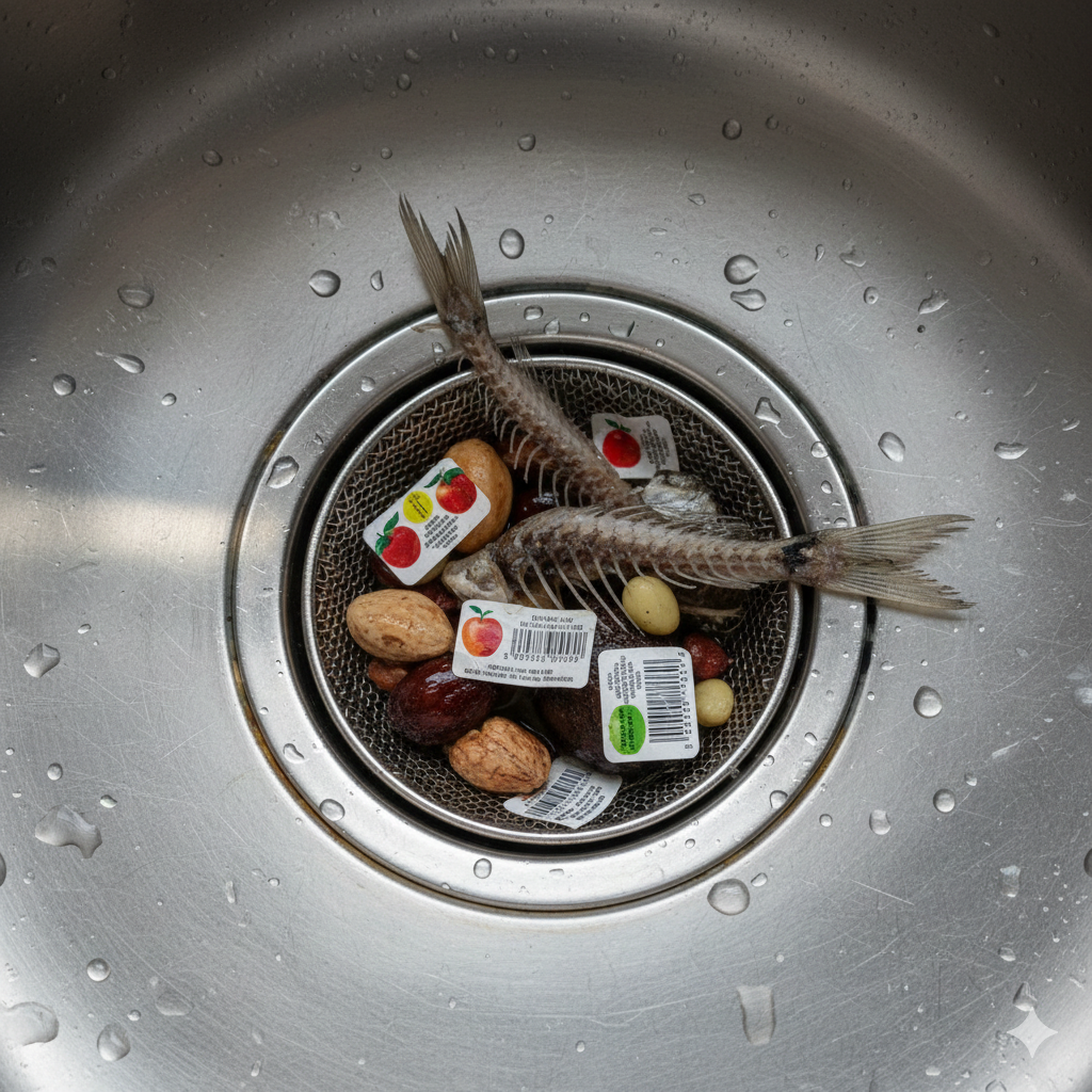 Nhãn dán trái cây, xương và hạt tuy nhỏ nhưng dễ mắc kẹt trong đường ống, tích tụ cặn bẩn hoặc làm hỏng máy nghiền rác, vì vậy cần bỏ vào thùng rác thay vì xả xuống cống.