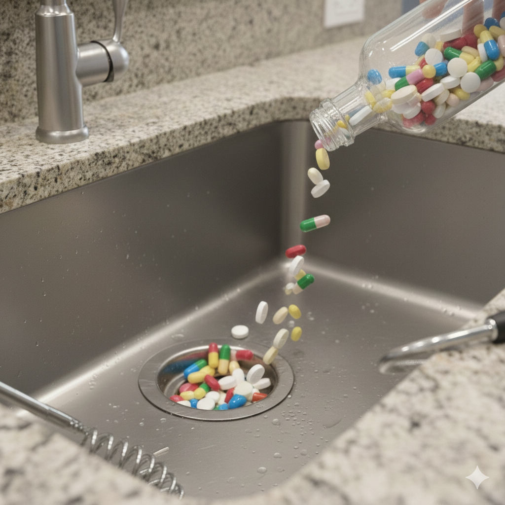 Xả thuốc tây xuống cống gây ô nhiễm nguồn nước và hệ sinh thái, vì vậy thuốc thừa hoặc hết hạn nên được xử lý đúng cách thay vì đổ vào bồn cầu.