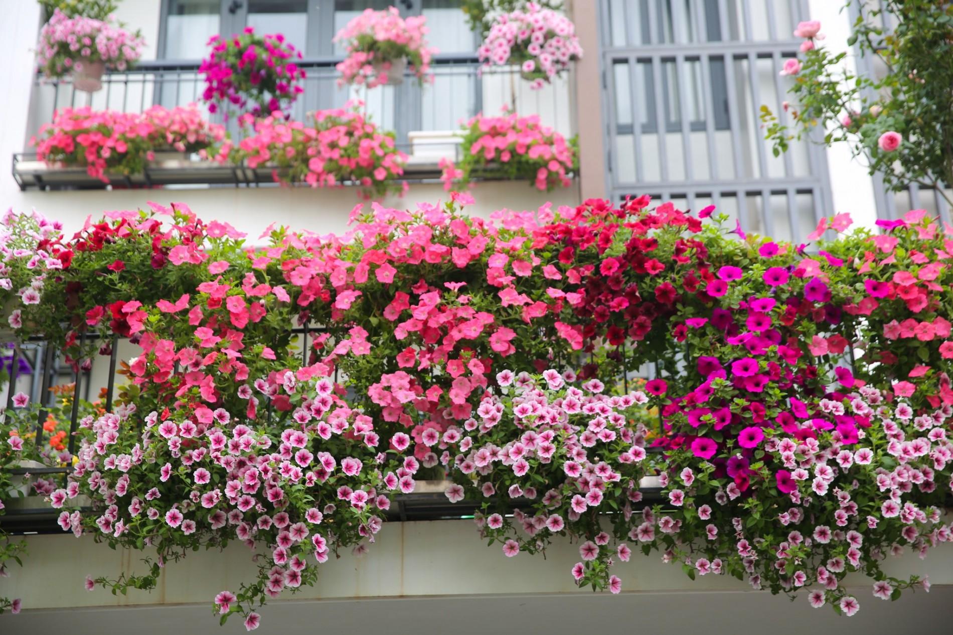 Những chậu hoa treo rực rỡ sắc màu mang đến không khí xuân ngập tràn cho ban công chung cư
