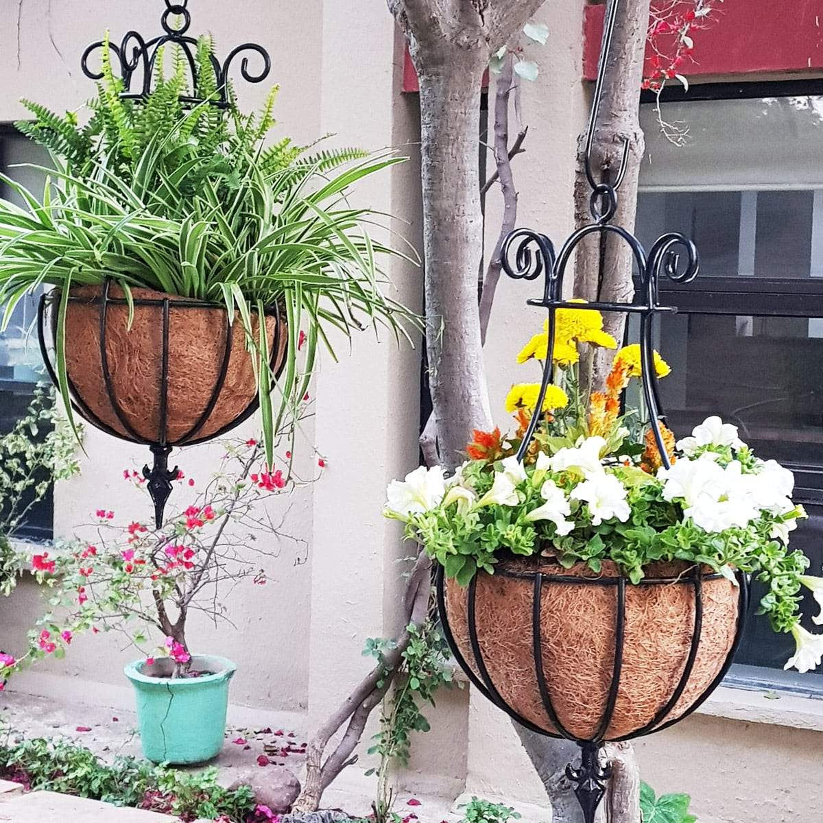 Đối với các loại hoa treo, trọng lượng là yếu tố cần lưu ý hàng đầu. Bạn nên ưu tiên sử dụng các loại chậu nhựa dày, composite có trọng lượng nhẹ và móc treo chắc chắn để đảm bảo an toàn tuyệt đối khi treo trên cao.
