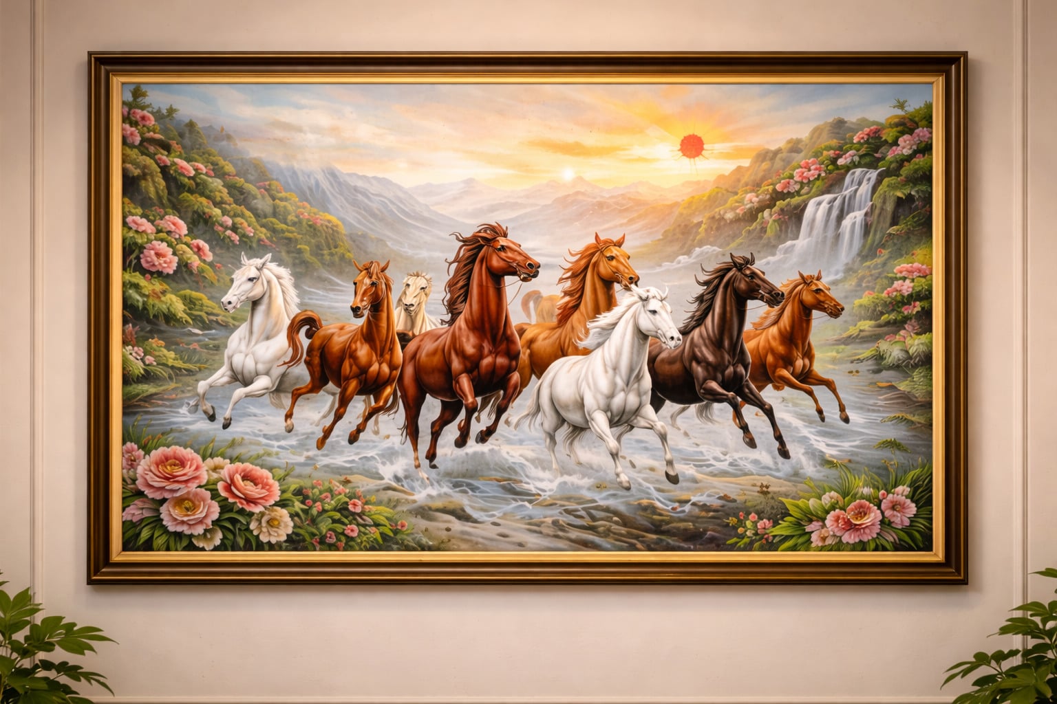 • Nhà tọa hướng Bắc: Hướng Bắc thuộc hành Thủy, xung khắc trực diện với hành Hỏa của tranh và của năm 2026. Treo tranh ngựa ở vị trí này dễ gây ra những mâu thuẫn trong quan hệ gia đình hoặc các tranh chấp pháp lý không đáng có.
