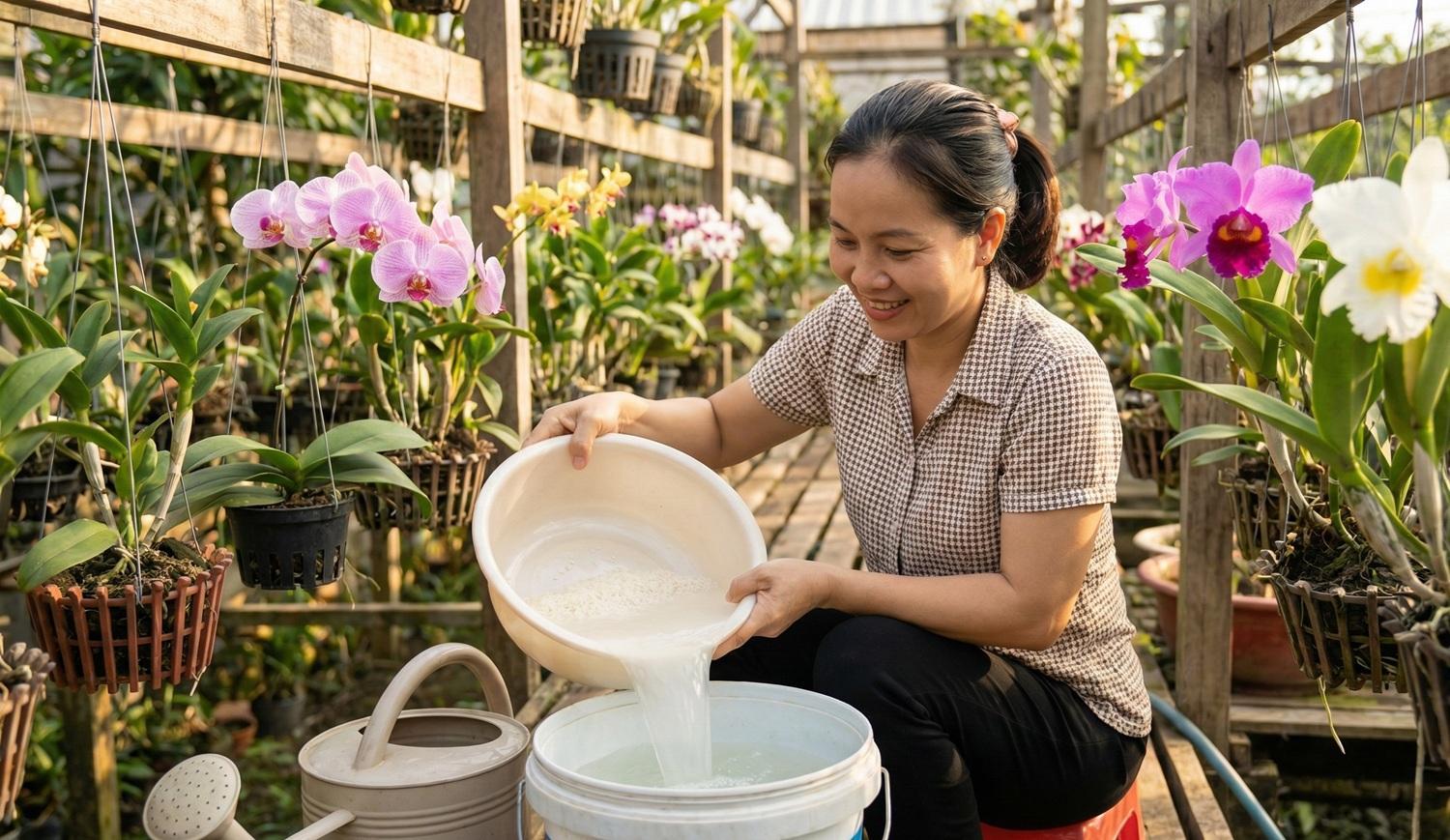 Nước vo gạo cung cấp nhiều chất dinh dưỡng giúp lan khỏe mạnh