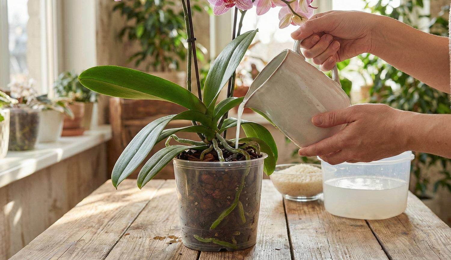 Nước vo gạo chứa nhiều dưỡng chất tự nhiên, rất an toàn cho bộ rễ nhạy cảm của lan