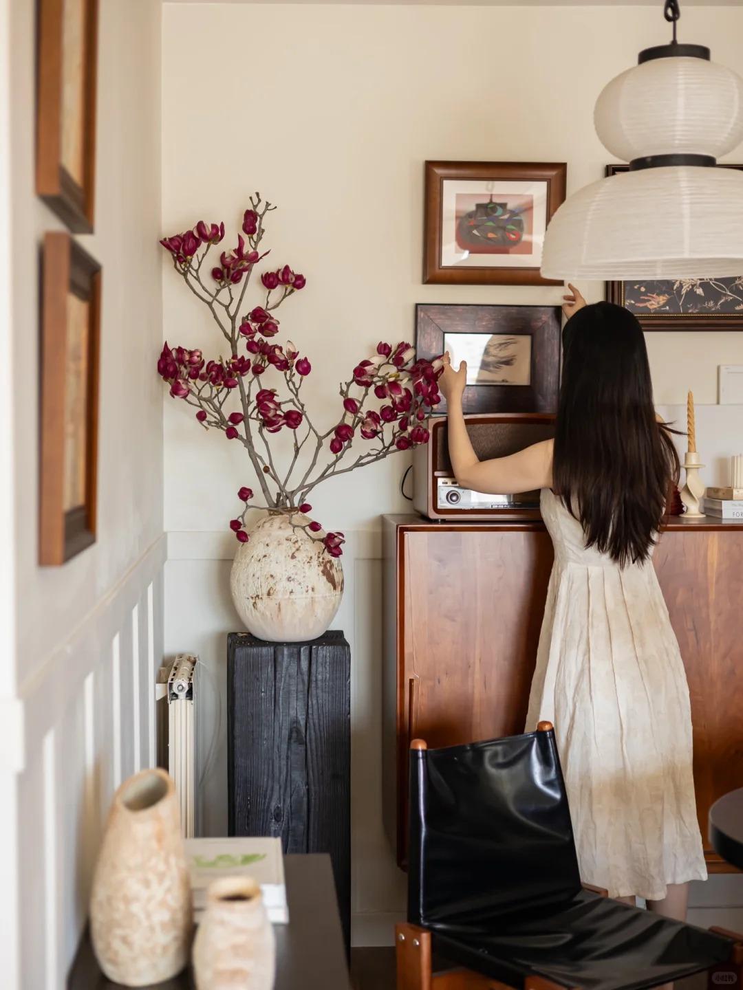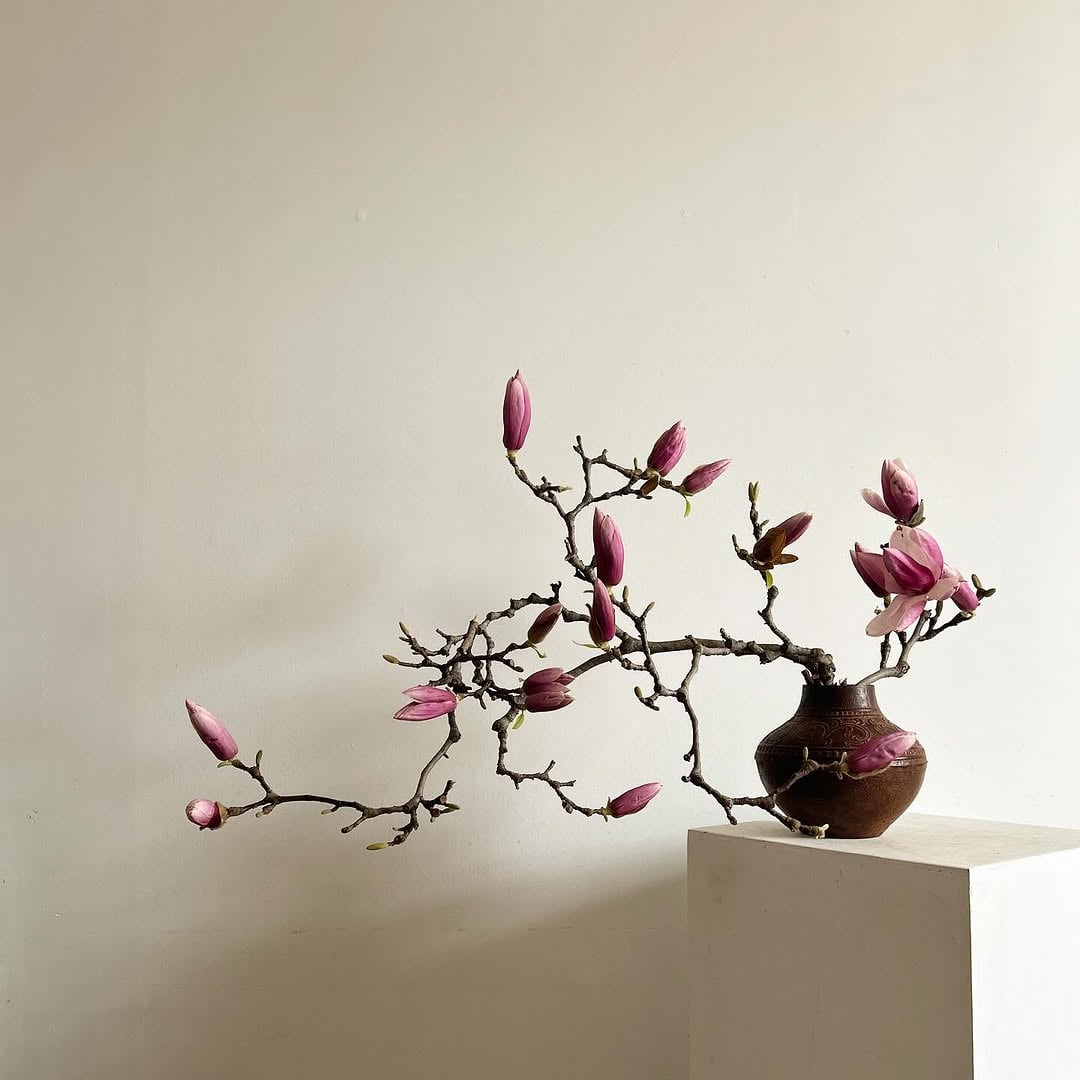 Với không gian mang hơi hướng Đông Dương hoặc Á Đông đương đại, mộc lan rất hợp với nền gỗ, vật liệu thô mộc và ánh sáng vàng dịu. Những bình đất nung, gốm thô, màu nâu, xanh rêu hoặc xám đậm giúp tổng thể trở nên ấm áp, có chiều sâu và sang trọng theo cách rất chậm rãi.