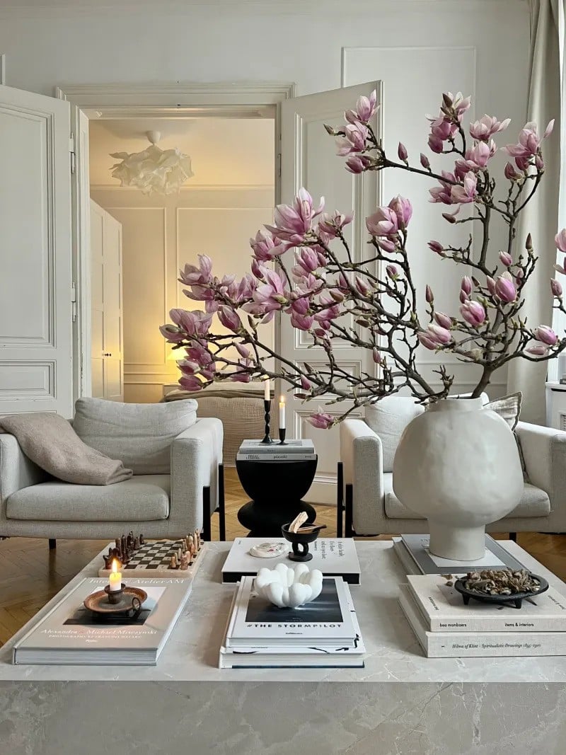 Đối với nhà phố hoặc biệt thự có phòng khách trên 30 m², trần cao từ 3 m trở lên, gia chủ có thể sử dụng bình lớn, miệng rộng, kết hợp mộc lan nhiều nhánh. Khi đó, bố cục hoa lan tỏa theo chiều ngang và chiều đứng, tạo trục thị giác rõ ràng và giúp không gian trông sang trọng, bề thế hơn trong dịp Tết.