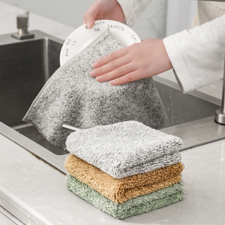 Khăn làm từ sợi Microfiber được khuyến khích sử dụng vì khả năng thấm hút dầu mỡ tốt, không để lại bụi vải trên bề mặt. Sau mỗi ngày sử dụng, khăn cần được giặt sạch và phơi khô hoàn toàn để tránh nấm mốc, mùi hôi.