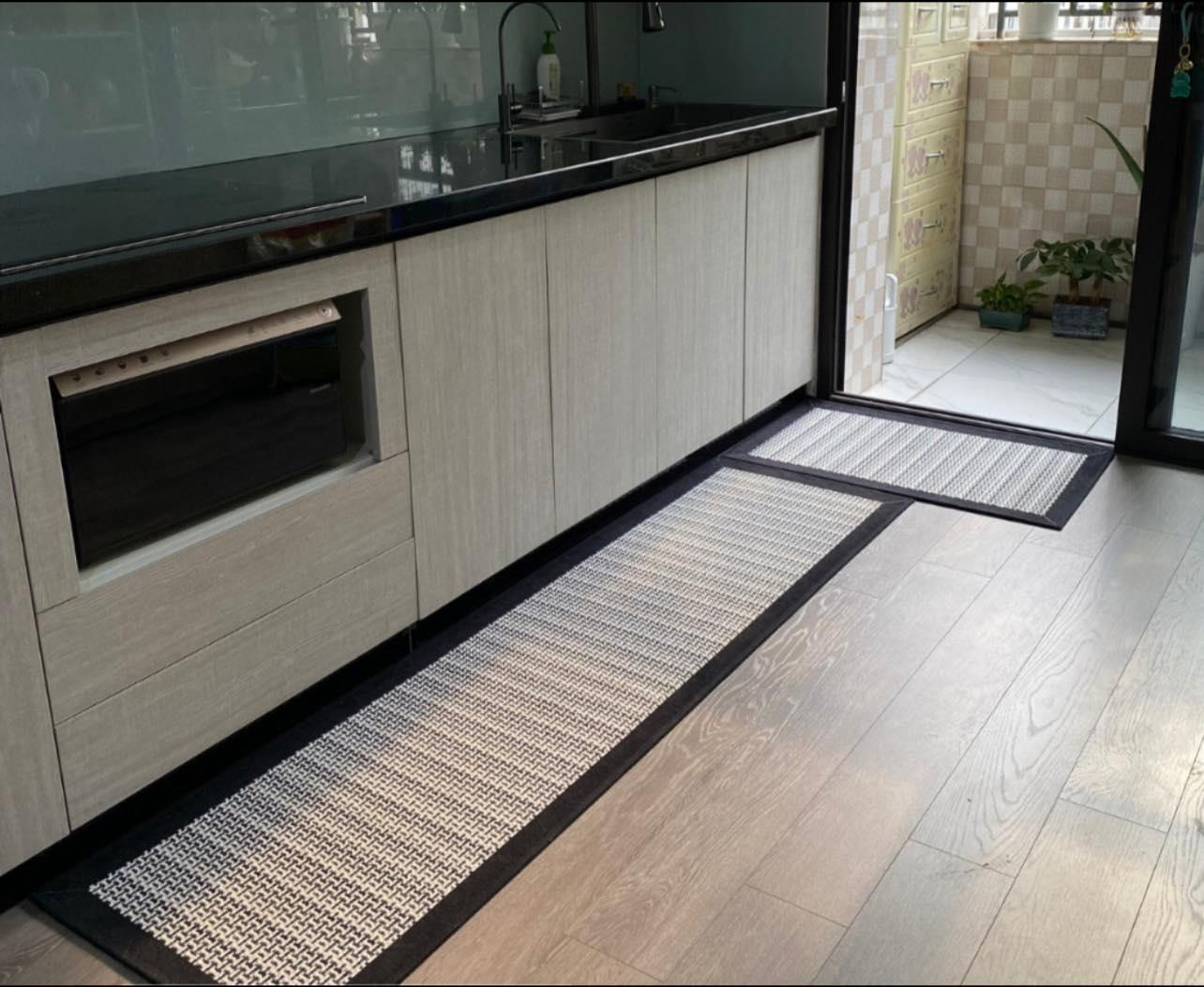 Thảm chùi chân thấm nước đặt ở khu vực bếp giúp hạn chế trơn trượt, giữ sàn sạch và an toàn trong quá trình nấu nướng.