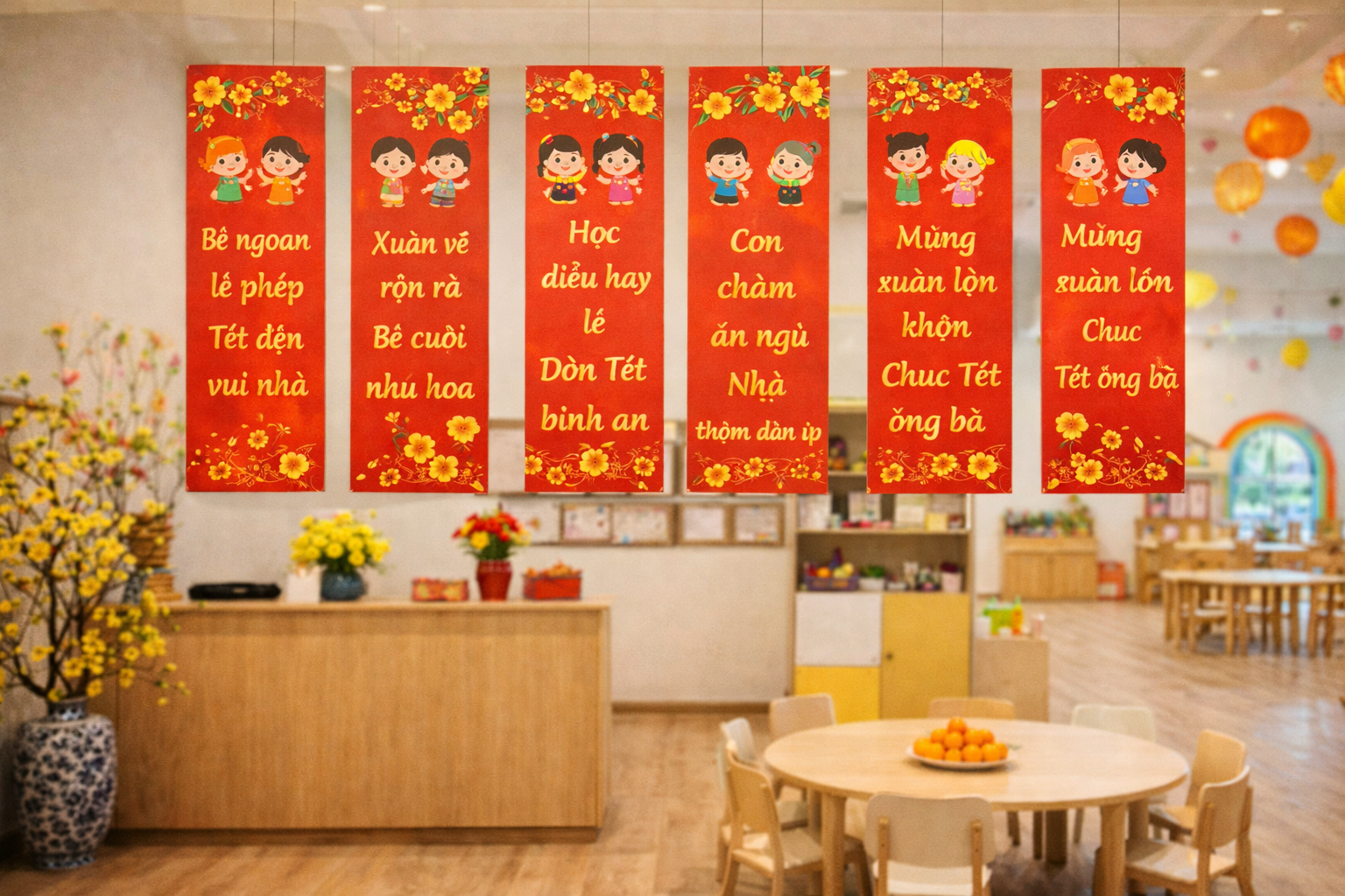Câu đối Tết mầm non thường ngắn gọn, dễ đọc, xoay quanh bé ngoan, học điều hay và không khí gia đình ấm áp ngày xuân.