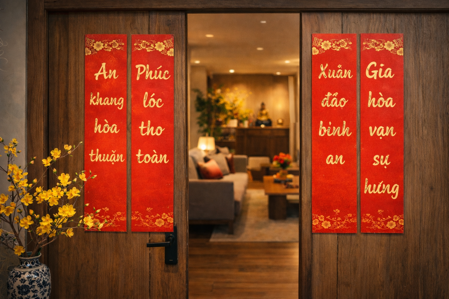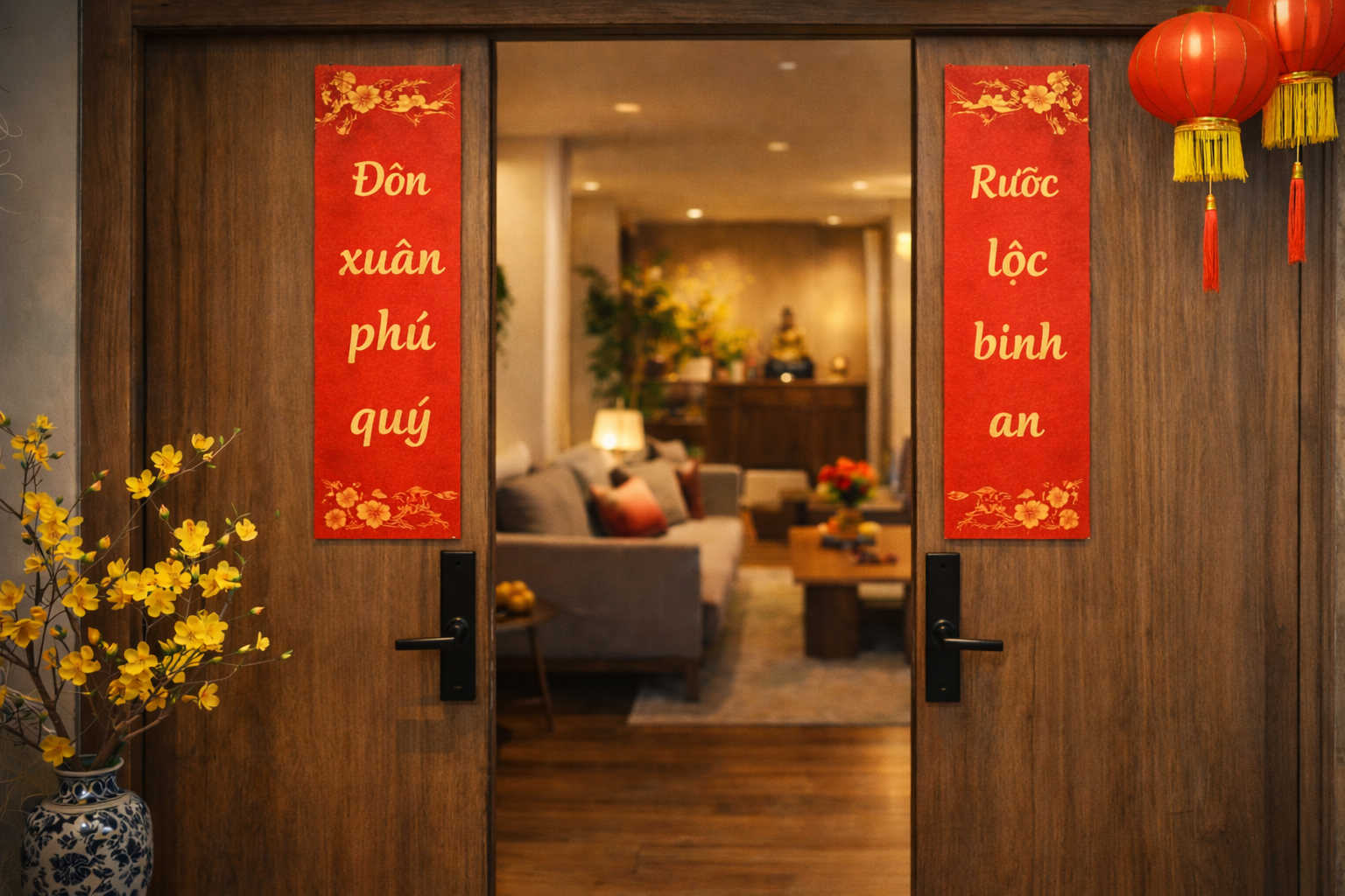 Nếu treo trước cửa, bạn nên chọn câu có ý “đón xuân – rước lộc”, câu chữ gọn, rõ. Hai vế treo cân nhau, canh thẳng mép cửa để nhìn gọn gàng.