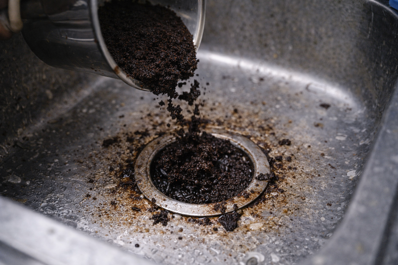 Bã cà phê không tan, dễ vón và bám ống nên là nguyên nhân phổ biến gây tắc cống, cần bỏ vào thùng rác hoặc ủ phân.