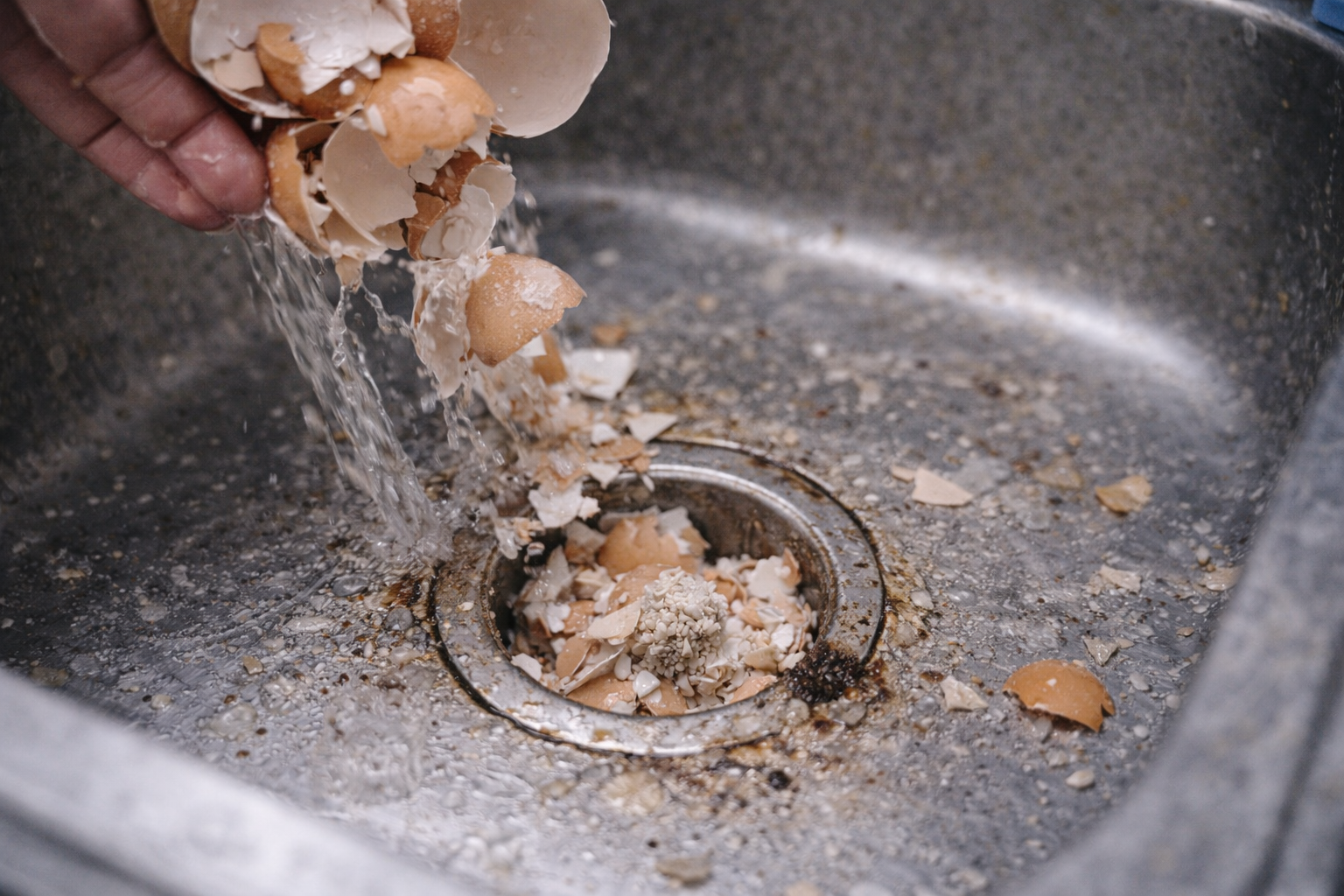 Vỏ trứng không nên đổ xuống cống vì phân hủy chậm, dễ bám ống và gây tắc nghẽn lâu dài.
