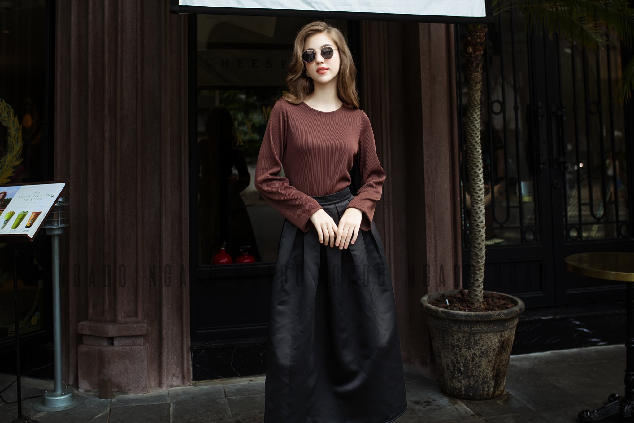 Màu sắc phù hợp là cà phê sữa, hồng nude. Các gam màu này tạo cảm giác gần gũi, dễ tạo thiện cảm. Trang sức rose gold mảnh giúp tổng thể thêm mềm mại.