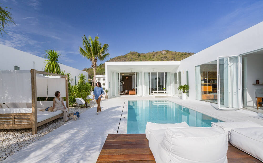 Thiết kế phòng khách mở, hướng nhìn ra bể bơi xanh mát là niềm mong ước của nhiều gia chủ. Phòng khách với hệ cửa kính lớn sát trần, có thể là cửa trượt hoặc cửa gấp, khi mở ra có thể hướng mắt ra khung cảnh bể bơi nước mát giúp thư thái, nghỉ ngơi và nạp lại năng lượng sau những giờ làm việc, học tập căng thẳng. Tuy nhiên, thiết kế mở này cũng đem đến nhiều bất tiện khi trời nắng nóng hoặc mưa gió lớn, nên cần trang bị rèm che chắn và cửa kính chắc chắn, chất lượng cao để đảm bảo an toàn.