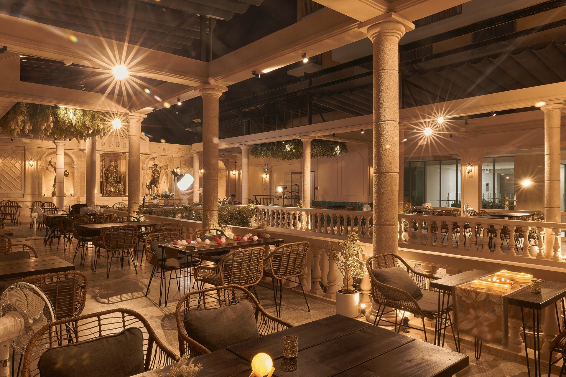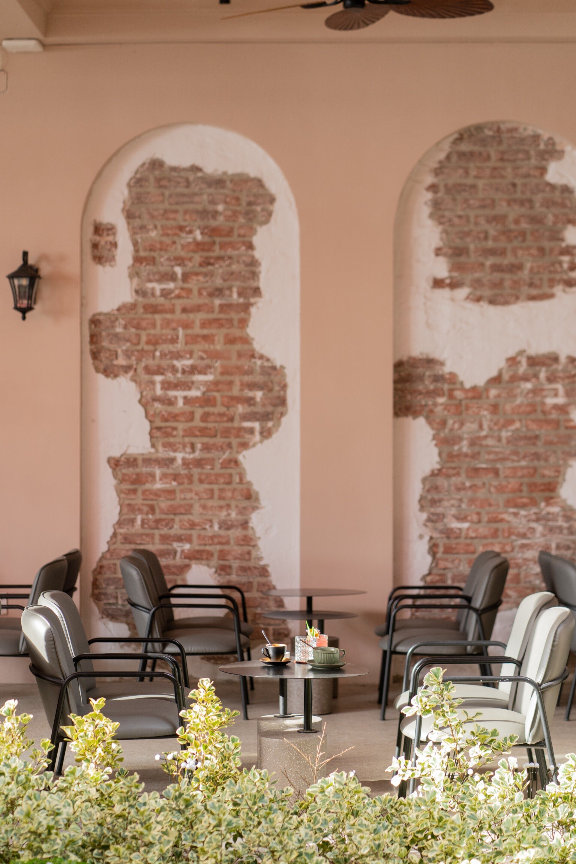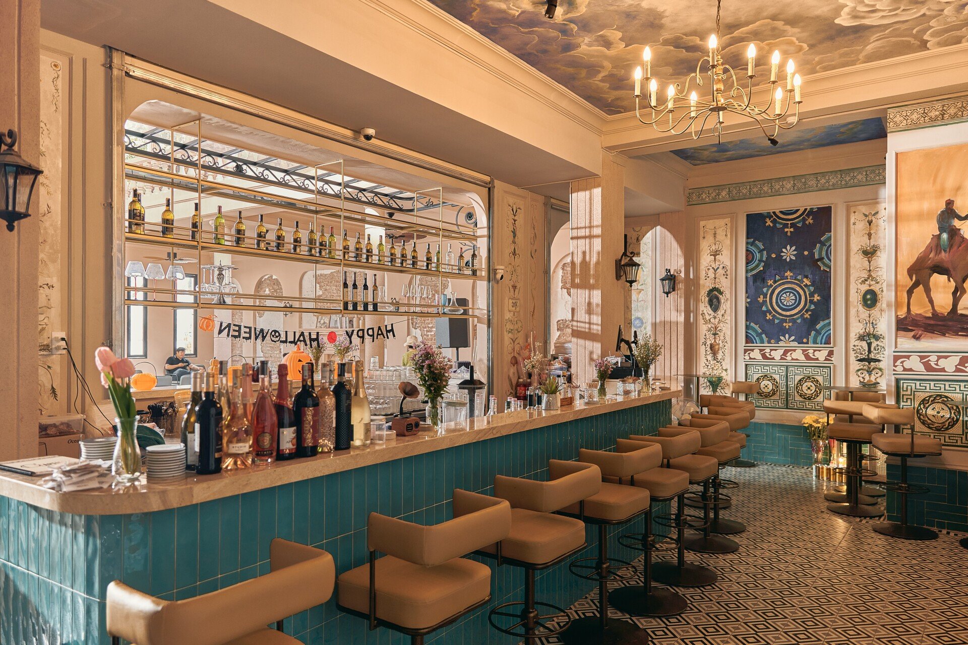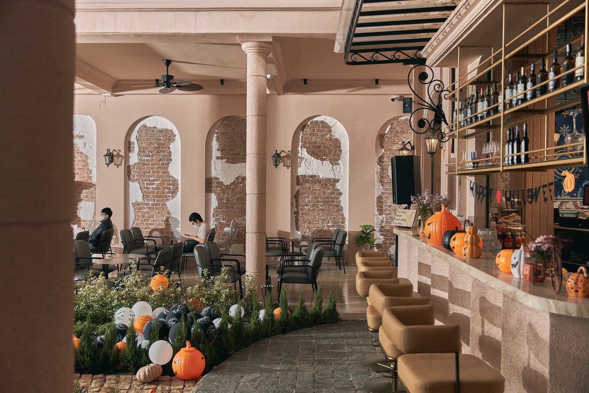 Bước vào nội thất, phong cách châu Âu cổ điển hiện lên qua từng chi tiết: những mái vòm uyển chuyển, gam màu trung tính sang trọng, ánh sáng dịu nhẹ từ đèn chùm cổ điển hòa quyện cùng chất liệu đá và gỗ tự nhiên. Các mảng tường được xử lý mộc mạc nhưng tinh tế, gợi cảm giác hoài cổ, trong khi đồ nội thất được lựa chọn kỹ lưỡng, vừa thoải mái vừa tôn lên vẻ quý phái. Không gian bar hiện đại ẩn mình bên trong, mang lại sự đối lập thú vị, nơi khách có thể tận hưởng những ly cocktail đầy cảm hứng trong bầu không khí sang trọng và nghệ thuật.