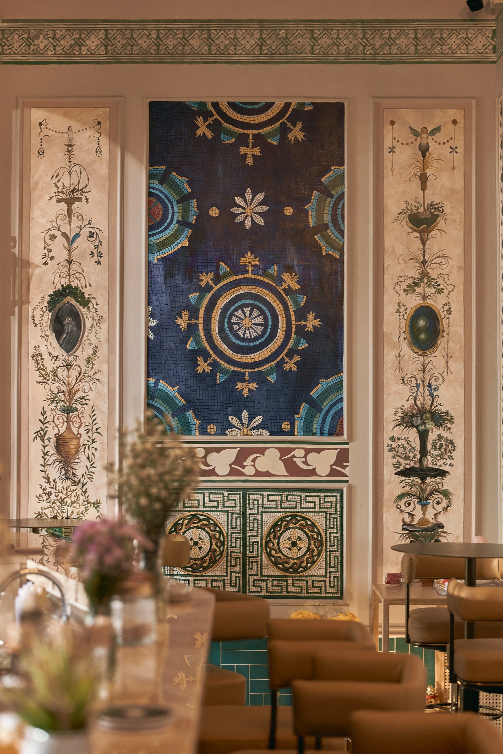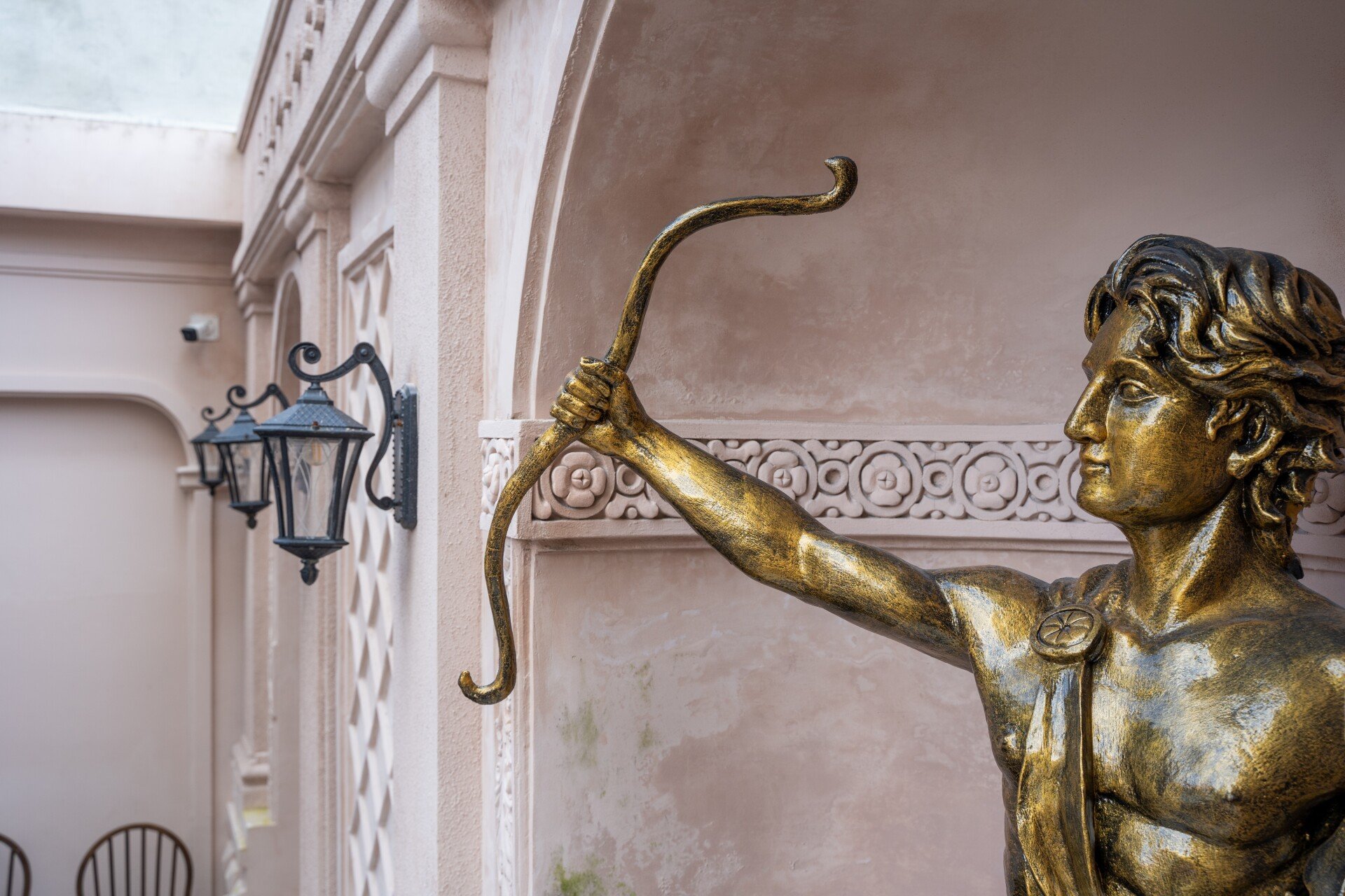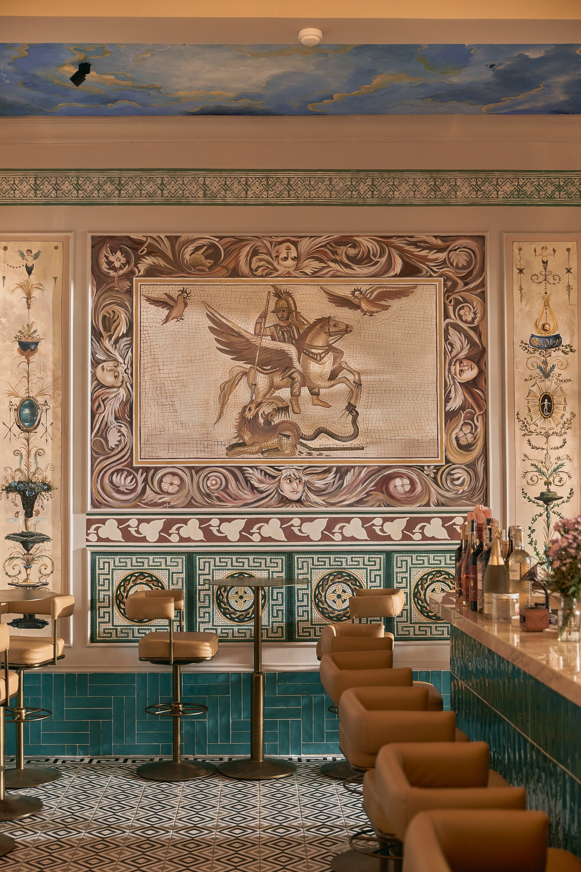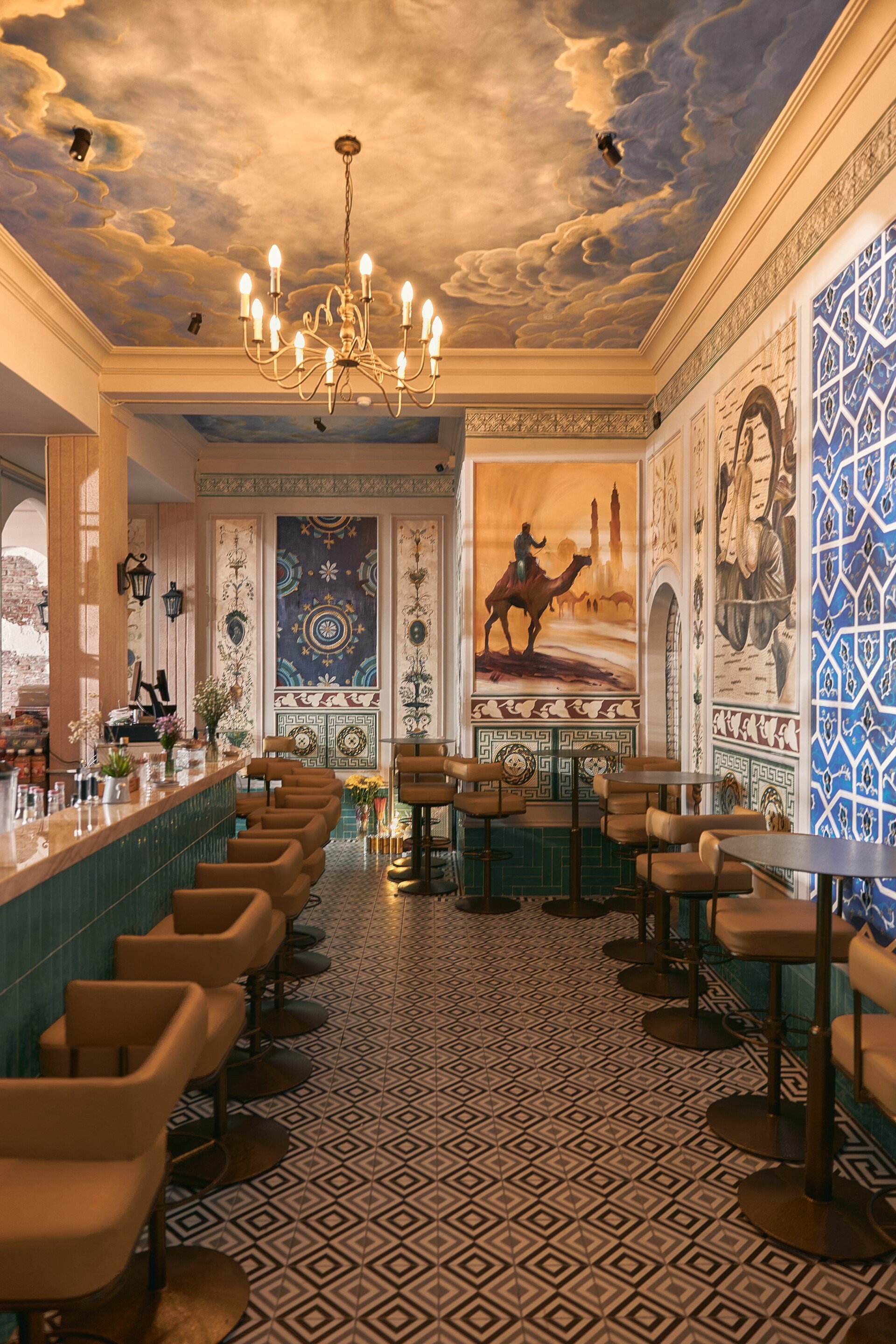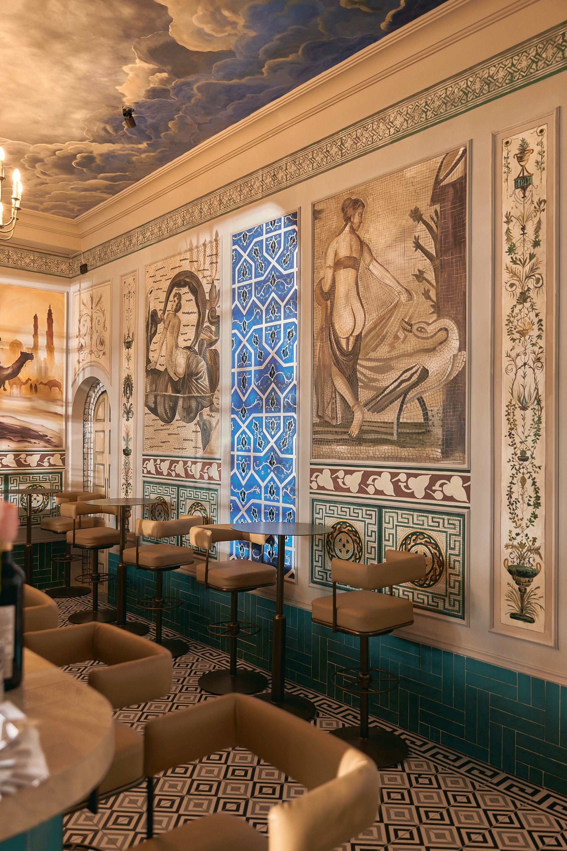 Bước vào nội thất, phong cách châu Âu cổ điển hiện lên qua từng chi tiết: những mái vòm uyển chuyển, gam màu trung tính sang trọng, ánh sáng dịu nhẹ từ đèn chùm cổ điển hòa quyện cùng chất liệu đá và gỗ tự nhiên. Các mảng tường được xử lý mộc mạc nhưng tinh tế, gợi cảm giác hoài cổ, trong khi đồ nội thất được lựa chọn kỹ lưỡng, vừa thoải mái vừa tôn lên vẻ quý phái. Không gian bar hiện đại ẩn mình bên trong, mang lại sự đối lập thú vị, nơi khách có thể tận hưởng những ly cocktail đầy cảm hứng trong bầu không khí sang trọng và nghệ thuật.