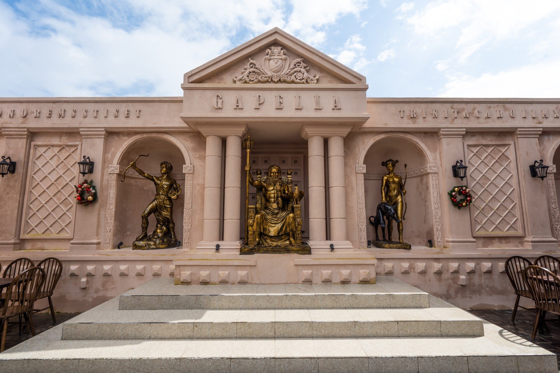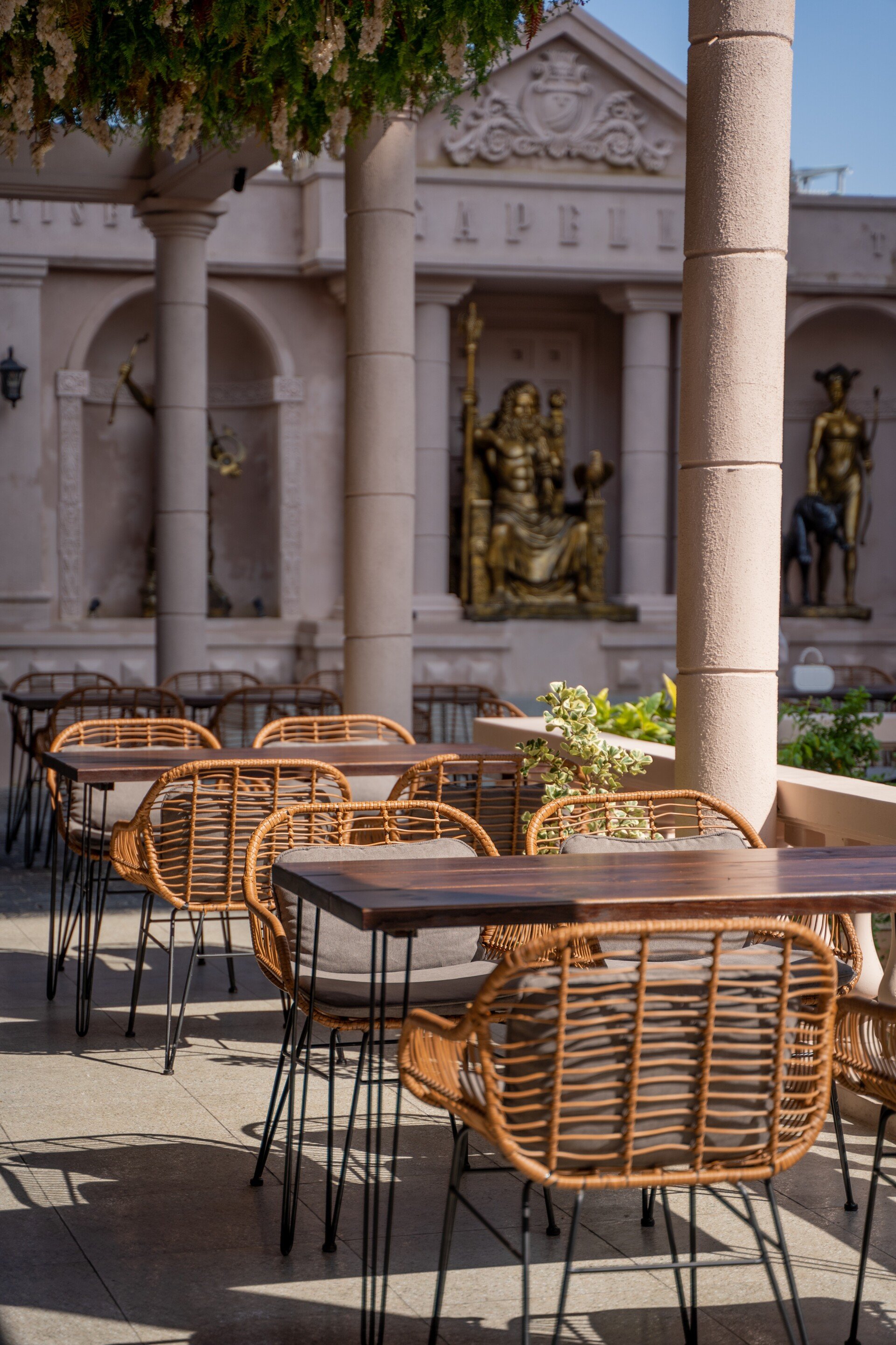 Từ ngoại thất, Gapella gây ấn tượng mạnh với những cột đá lớn, vững chãi, gợi nhớ hình ảnh của Parthenon cổ đại. Mặt tiền mở rộng hướng ra dòng sông, nơi ánh sáng mặt trời ban ngày khẽ chạm vào từng chi tiết, còn buổi tối lại lung linh dưới ánh đèn vàng ấm áp, khiến nhà hàng như một ngôi đền soi bóng xuống mặt nước hiền hòa. Không gian ngoài trời rộng thoáng, được sắp đặt tinh tế để thực khách vừa thưởng thức ẩm thực, vừa tận hưởng trọn vẹn khung cảnh sông nước lãng mạn của Đà Nẵng.
