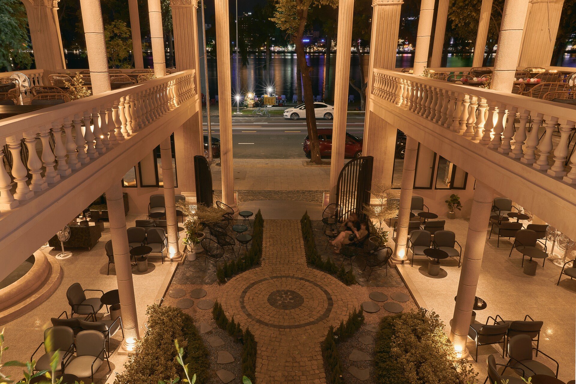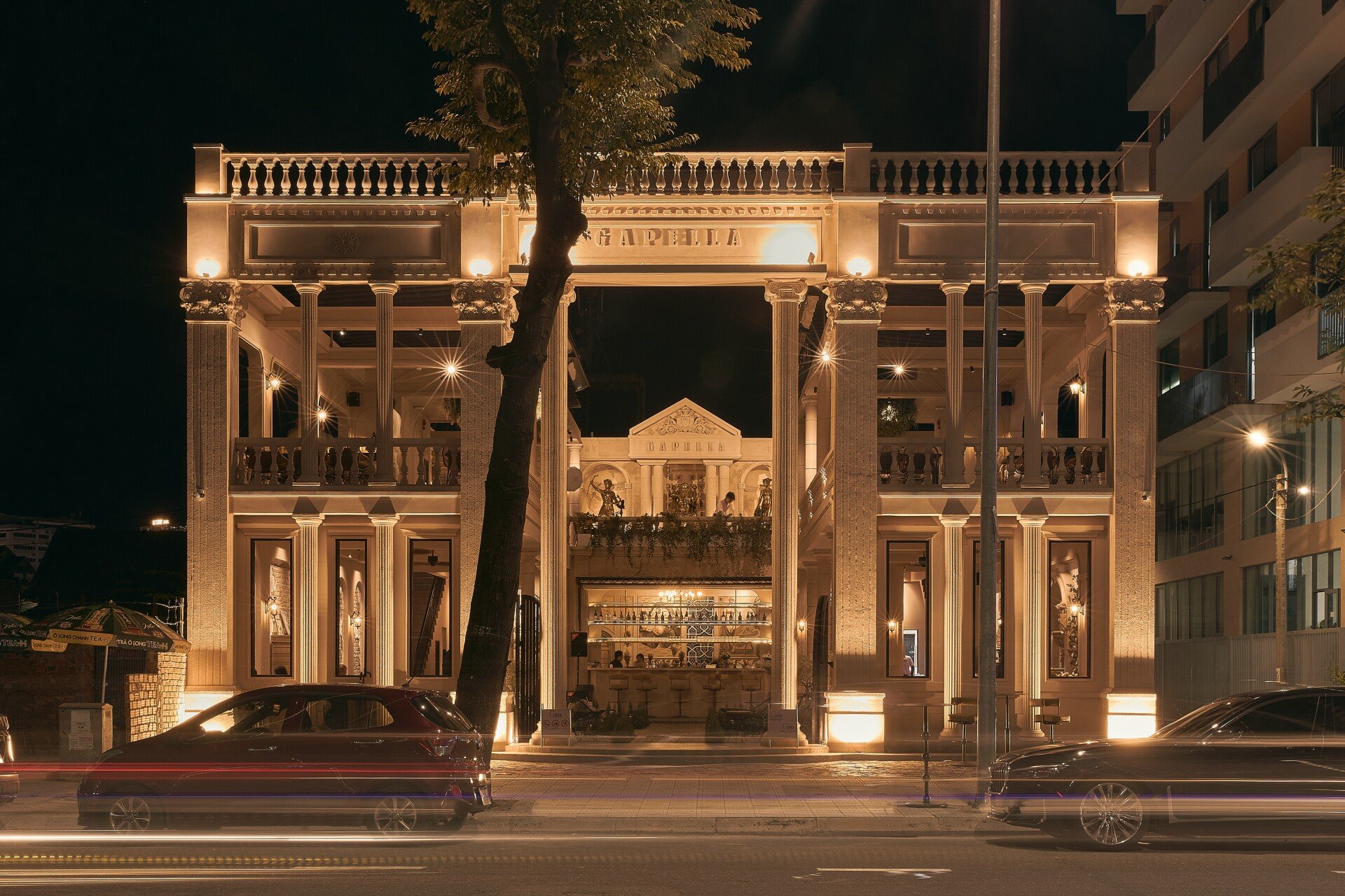 Dọc theo bờ sông Hàn lộng gió, Gapella Dining & Cocktail Bar hiện lên như một tuyệt tác kiến trúc mang hơi thở châu Âu cổ điển. Công trình được S2 Studio thiết kế và thi công, lấy cảm hứng từ những ngôi đền Hy Lạp tráng lệ, kết hợp cùng sự tinh tế trong đường nét của phong cách kiến trúc châu Âu xưa, tạo nên một không gian vừa sang trọng vừa đầy chất thơ.