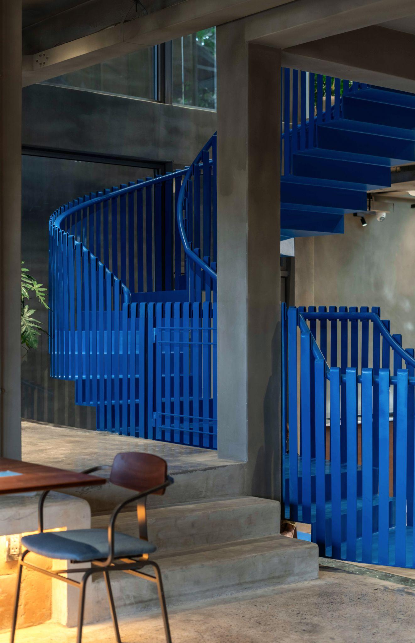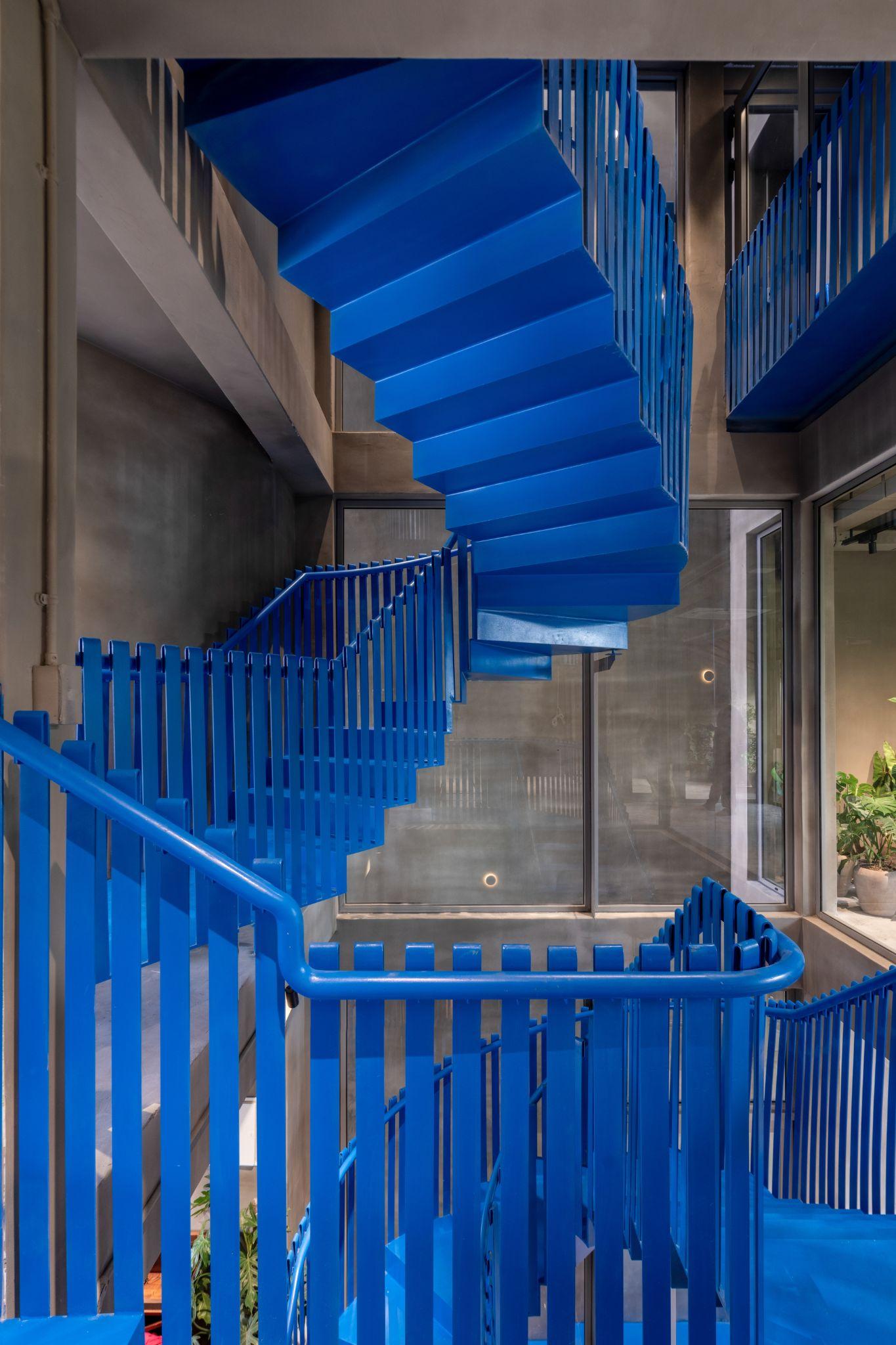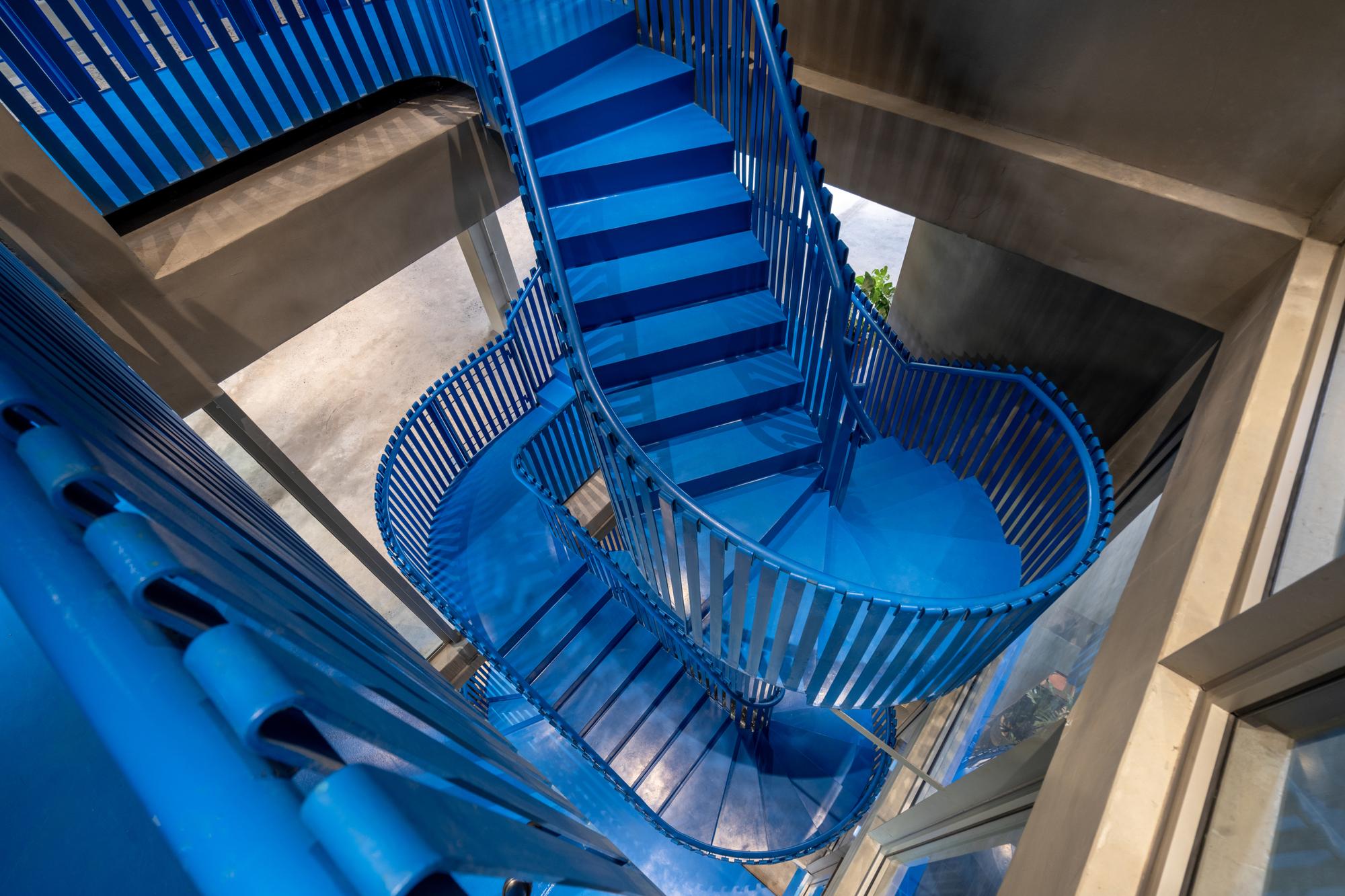 Cầu thang xoắn màu xanh lam nổi bật trong không gian như một tác phẩm điêu khắc, không chỉ dẫn dắt chuyển động qua các tầng mà còn mang đến một cảm giác chuyển động liên tục. Chiếc cầu thang đặc biệt này cũng tạo thành trục trung tâm cho công trình.