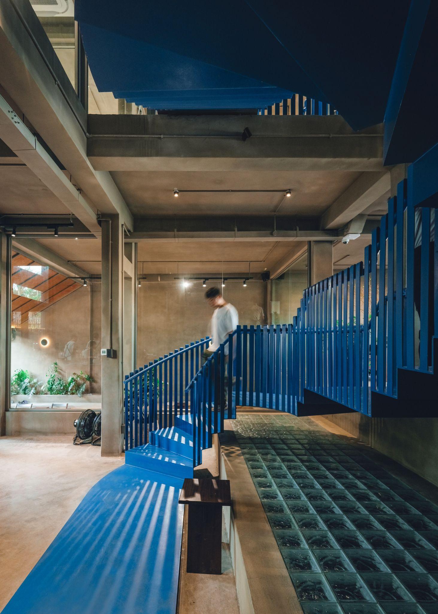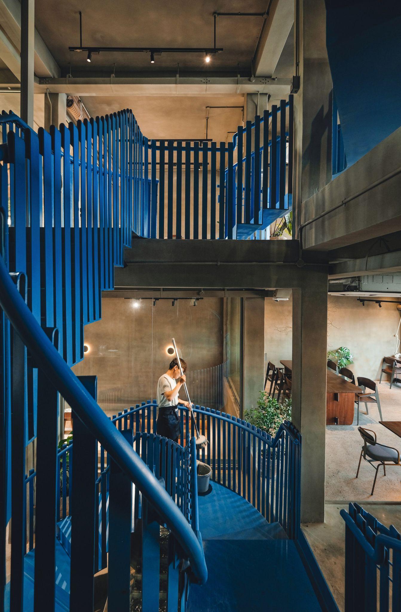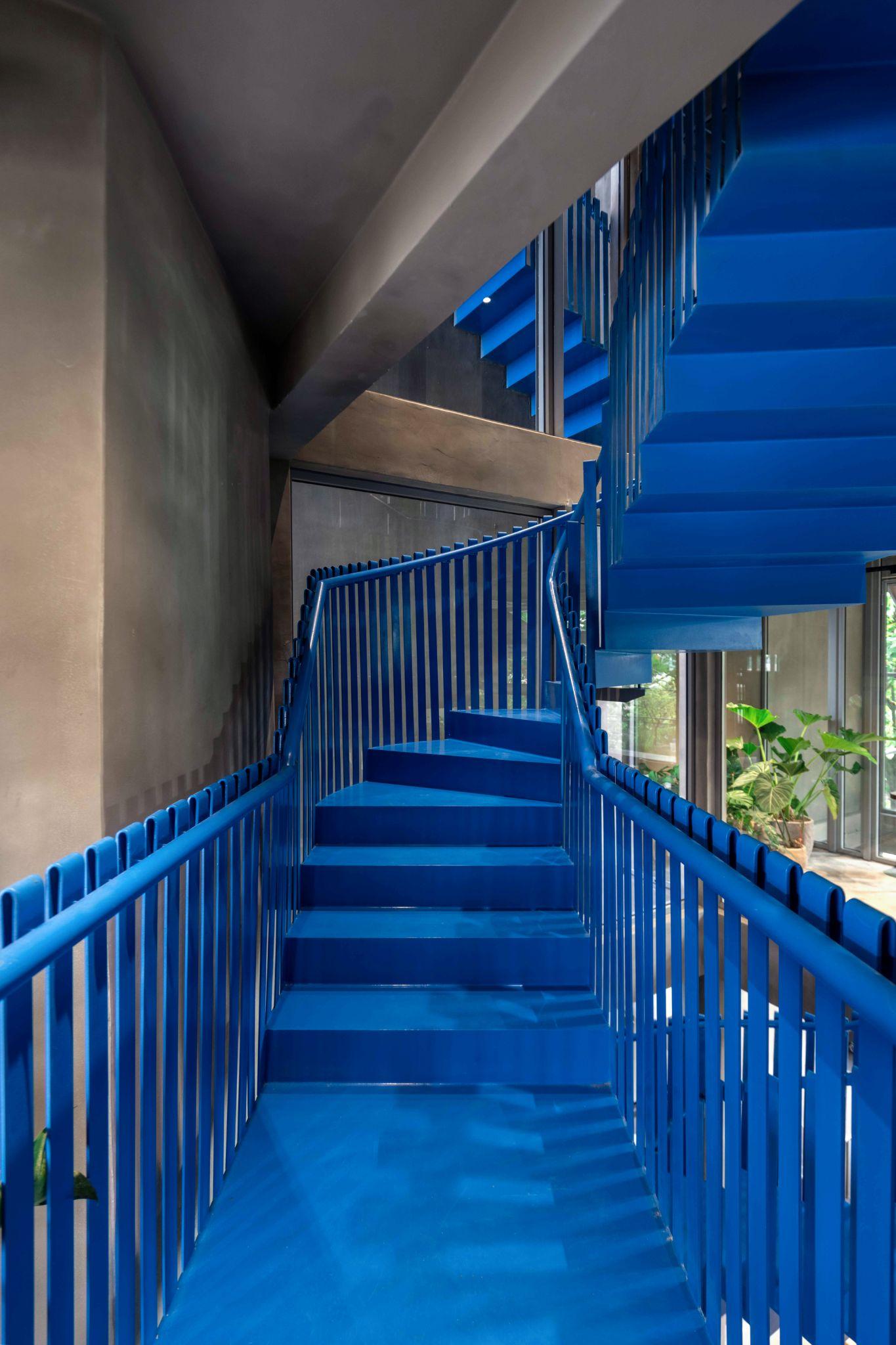 Cầu thang xoắn màu xanh lam nổi bật trong không gian như một tác phẩm điêu khắc, không chỉ dẫn dắt chuyển động qua các tầng mà còn mang đến một cảm giác chuyển động liên tục. Chiếc cầu thang đặc biệt này cũng tạo thành trục trung tâm cho công trình.