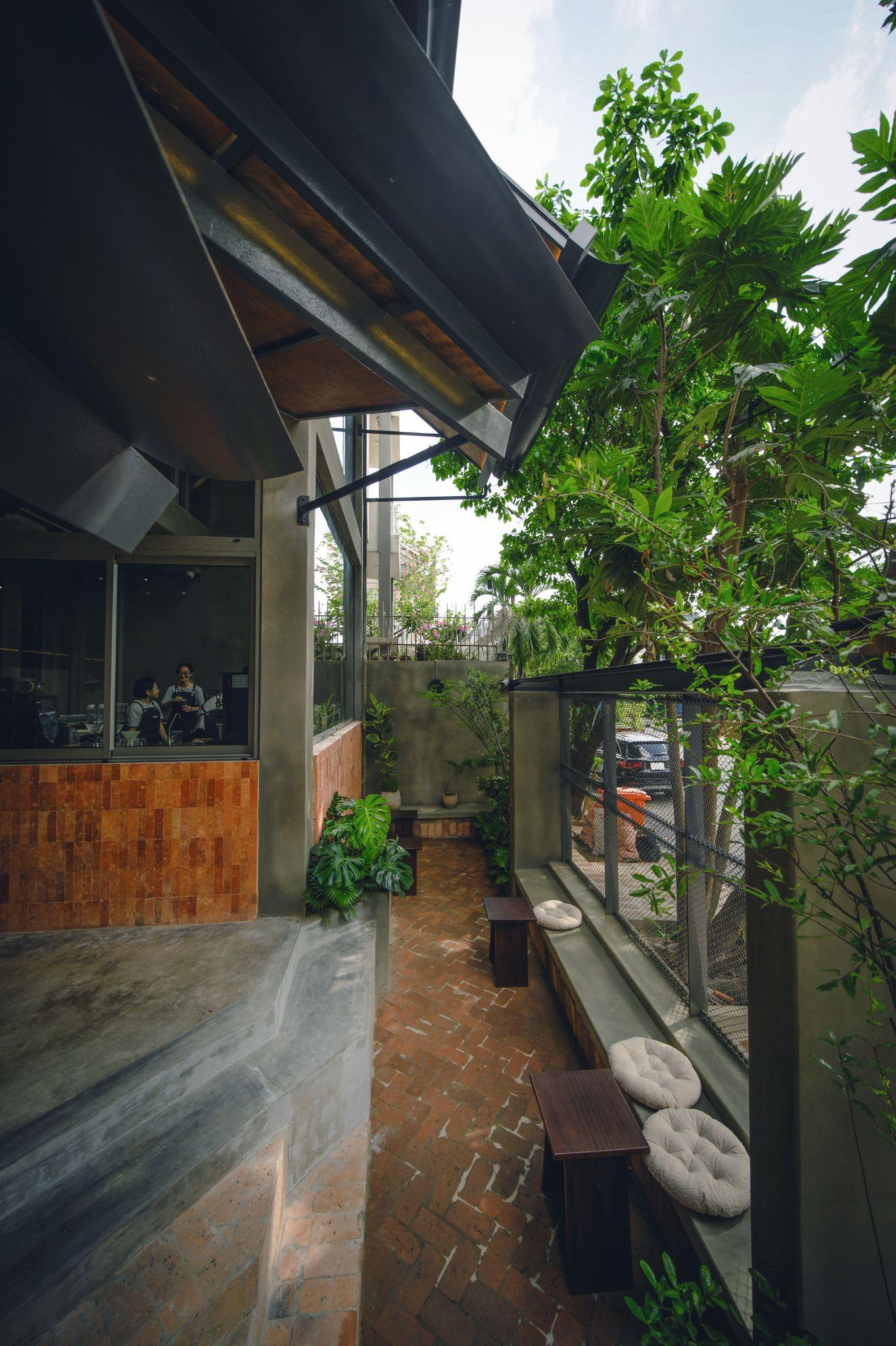 Ở góc công trình hướng ra sông, nơi trước đây bị tách biệt thì nay có phần mái uốn cong nhẹ nhàng, gợi nhắc đến những ngôi nhà cộng đồng truyền thống. Phần mái hiên này còn được phủ lớp mây đan thủ công để làm mềm mại khung thép, tạo nên một cảm giác gần gũi và dễ chịu.