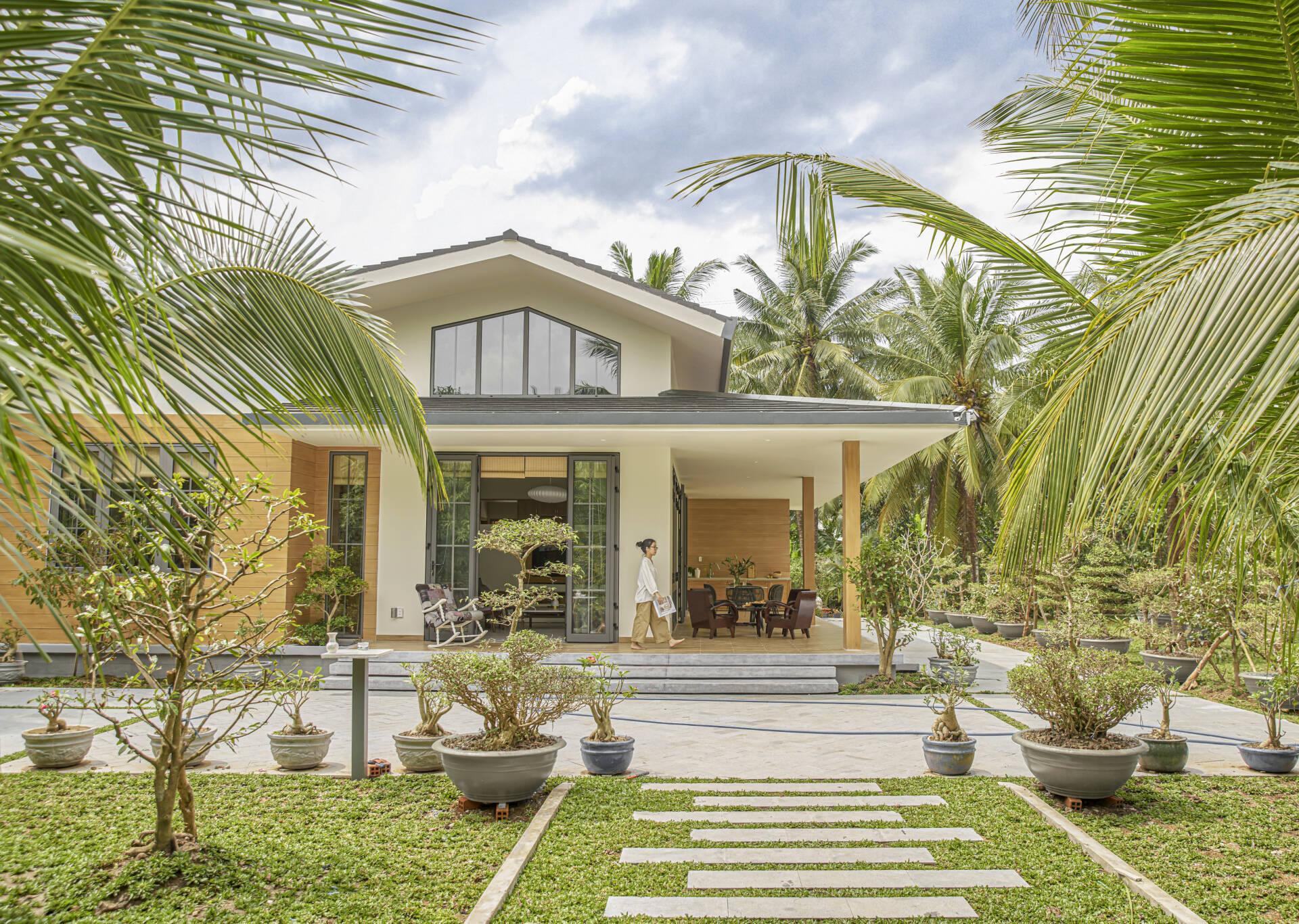 Nhà có ánh sáng tự nhiên, gió lưu thông, cây cối xanh tốt, bầu không khí trong lành và cảm giác dễ chịu khi bước vào.