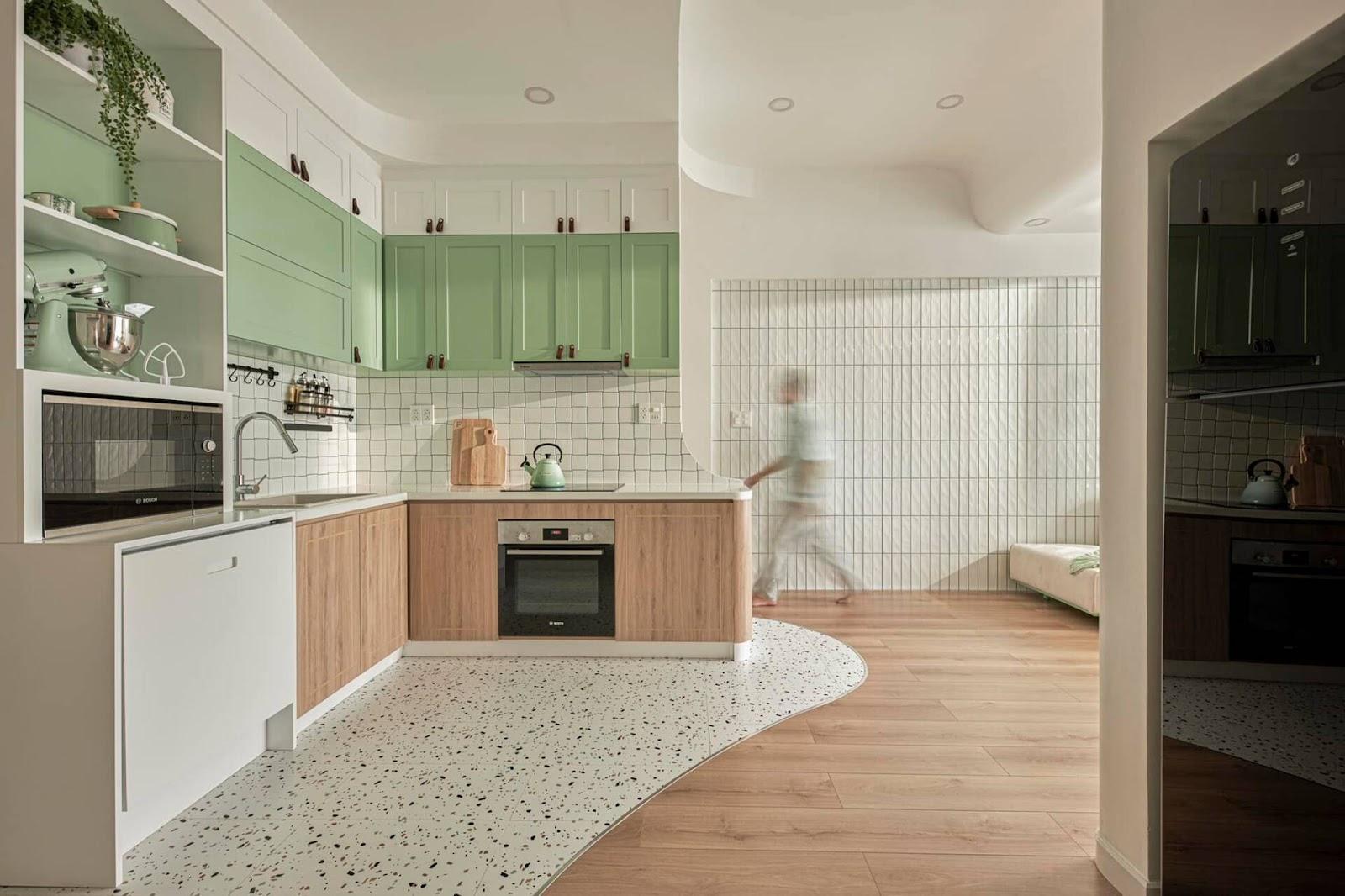 Nên chọn sàn bếp chống trơn trượt và bền bỉ với thời gian (Ảnh: Căn hộ thông tầng)