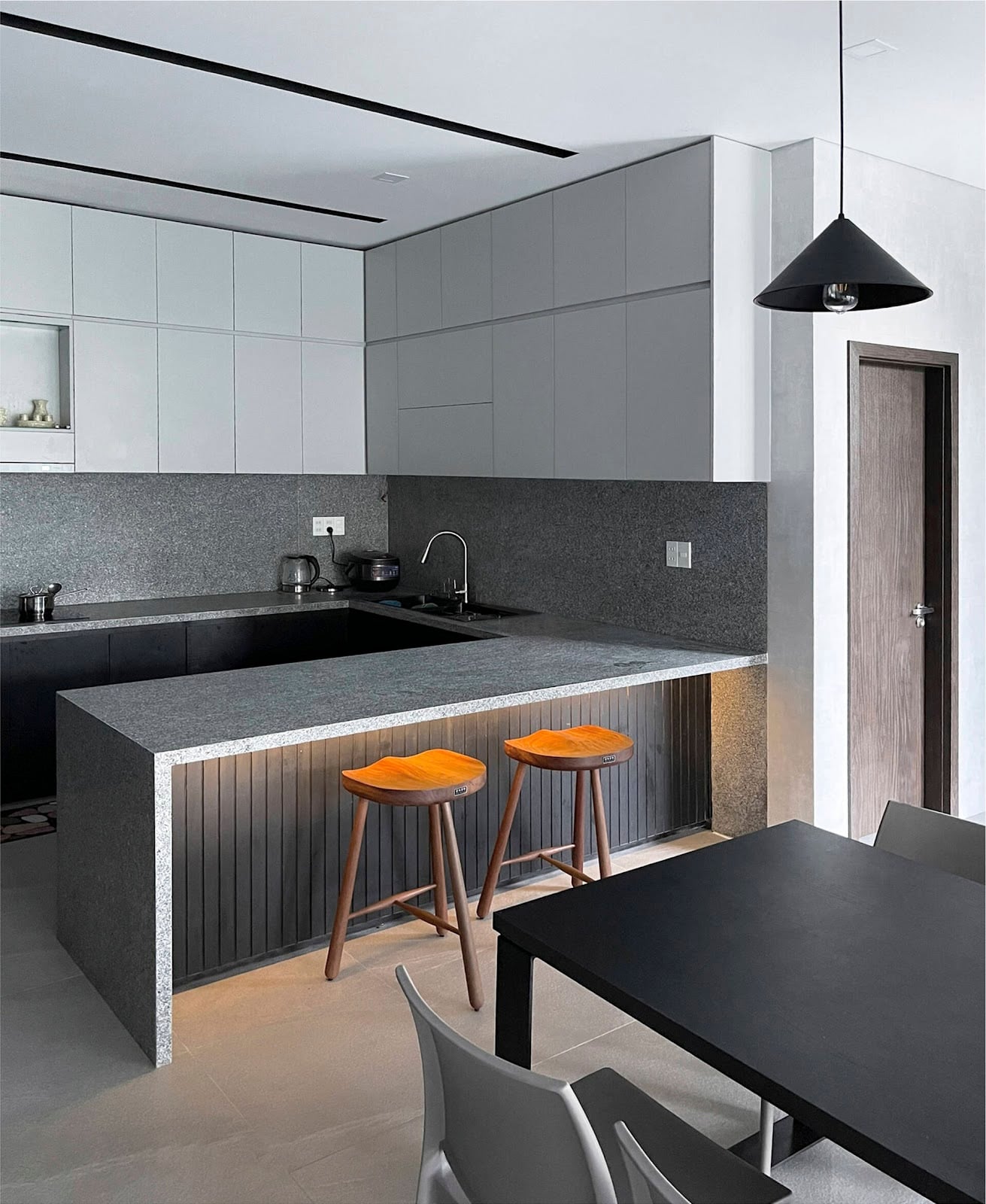 Giải pháp hợp lý là dùng màu tối như một điểm nhấn: có thể là hệ tủ bếp dưới, đảo bếp, mặt đá hoặc một vài chi tiết phụ kiện độc đáo. Khi kết hợp với nền sáng hoặc tông màu tự nhiên như trắng kem, be, gỗ sáng, tổng thể thiết kế phòng bếp sẽ vừa hài hòa, vừa tạo ấn tượng tinh tế và dễ chịu cho người sử dụng.