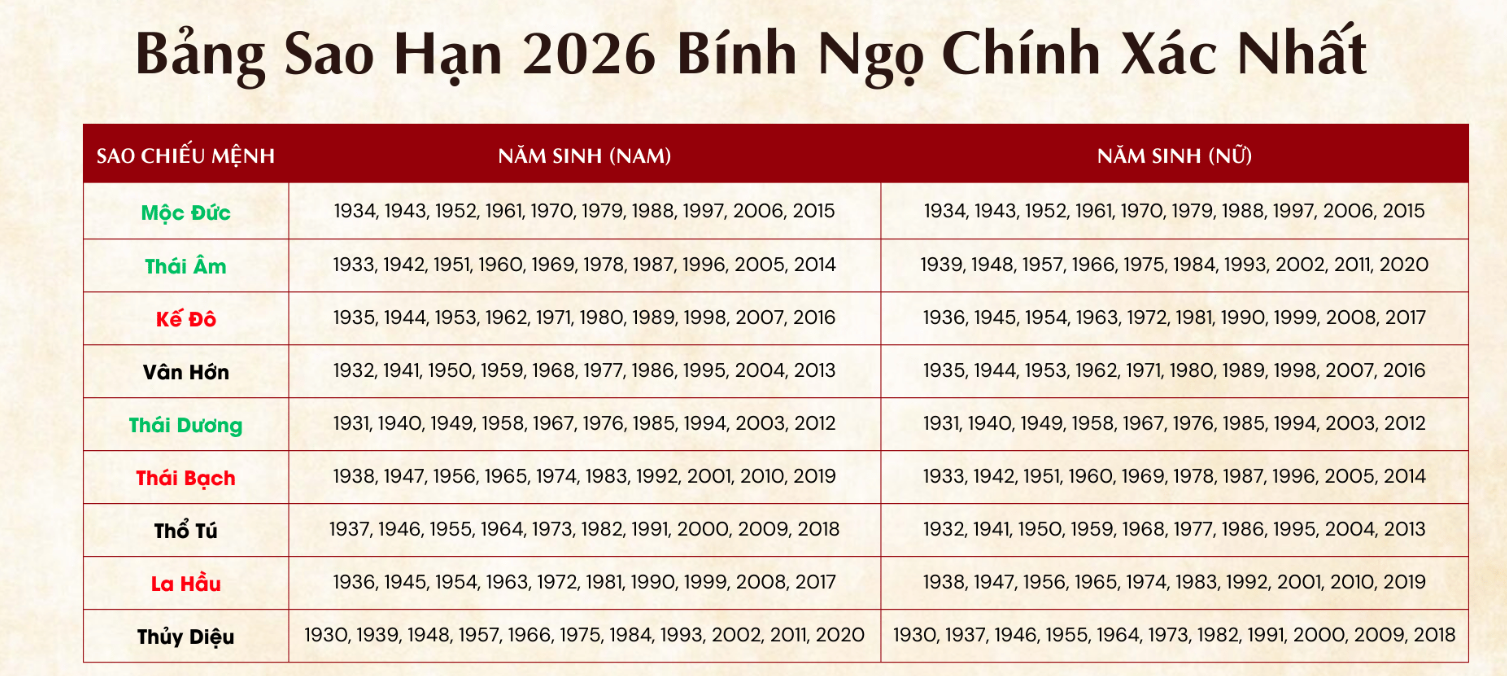 Bảng sao hạn chi tiết cho cả nam và nữ năm 2026