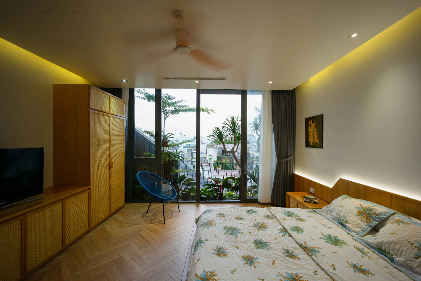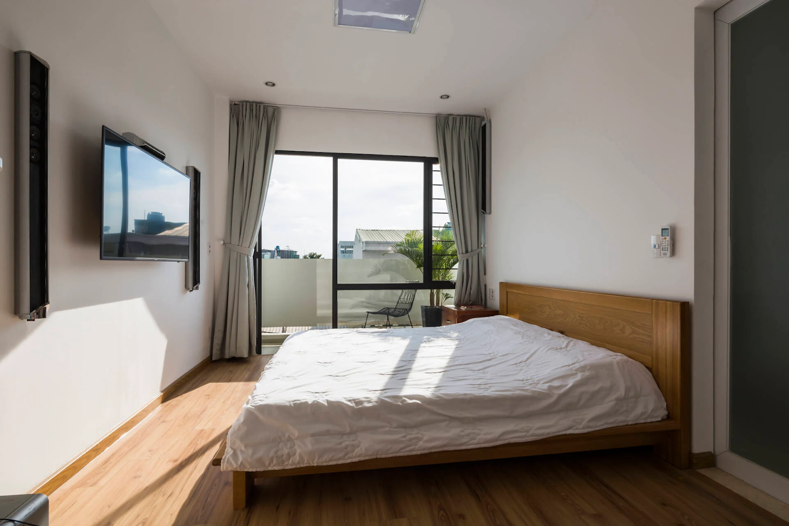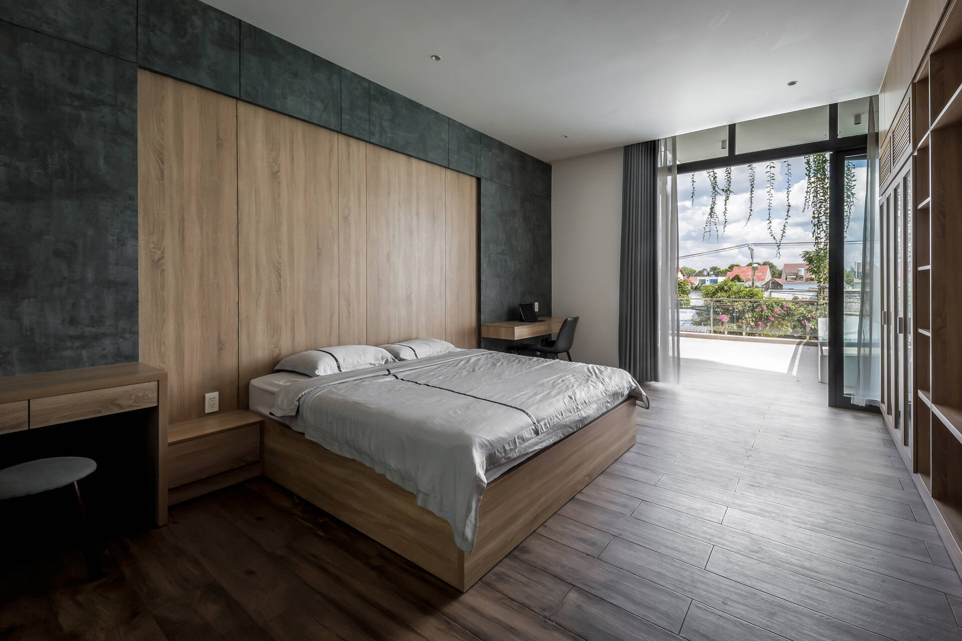 Trong thiết kế phòng ngủ nhà ống, nên đặt giường cạnh cửa sổ có rèm che để điều tiết ánh sáng và đảm bảo sự riêng tư (Ảnh: Kim Long House)