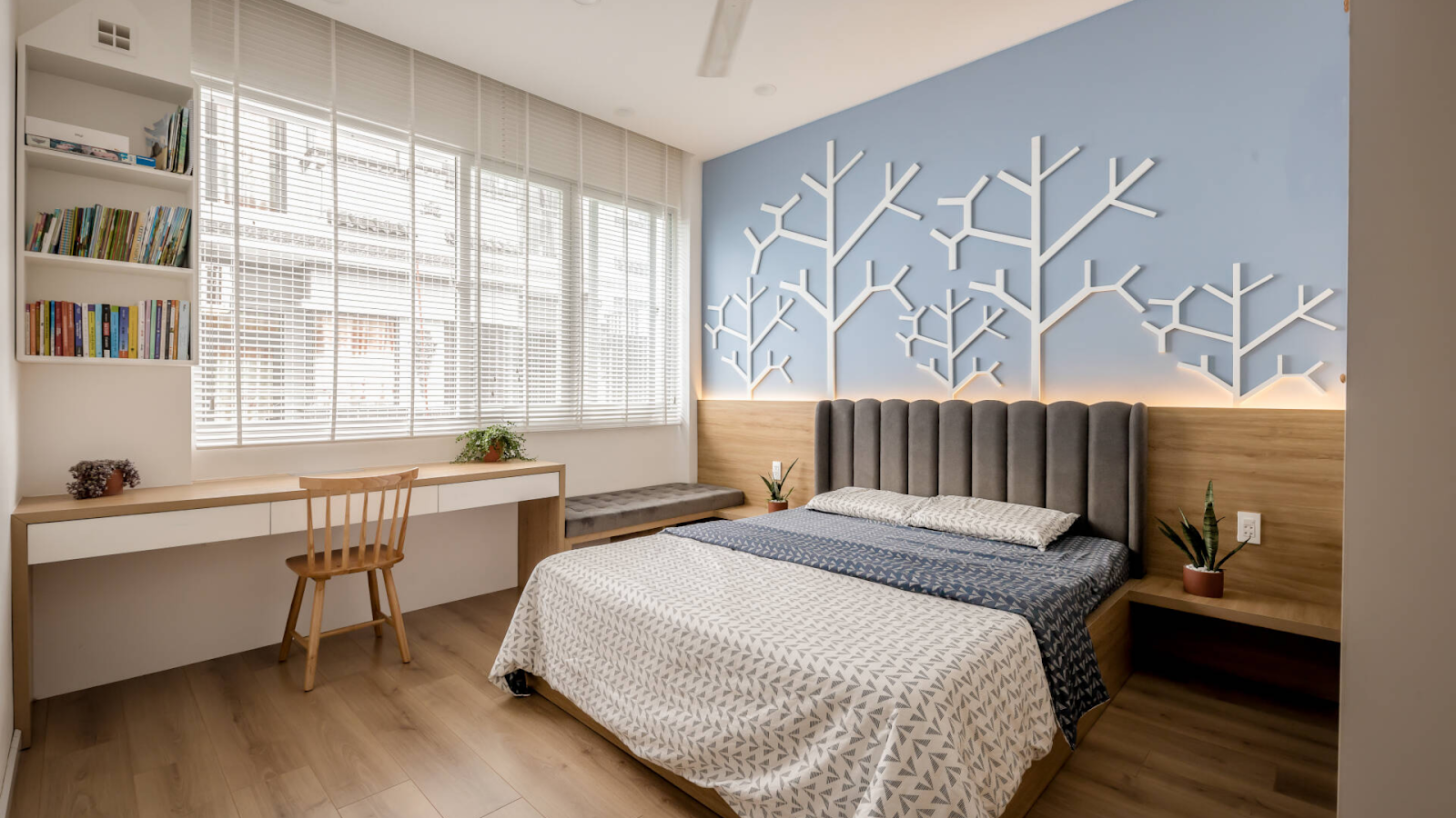 Thiết kế phòng ngủ nhà ống nên ưu tiên kết hợp hài hòa giữa ánh sáng tự nhiên và ánh sáng nhân tạo (Ảnh: Nhà phố 2 tầng tại Đồng Nai)