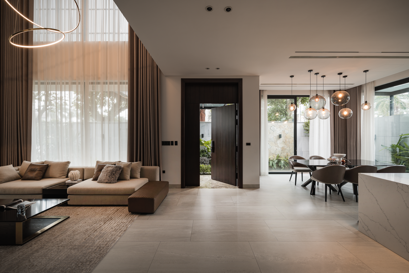 Villa Vinh Tân sử dụng loại gạch ốp sàn tông màu be sáng, giúp cân bằng bảng màu của thiết kế tổng thể và tôn lên vẻ đẹp của nội thất trong nhà
