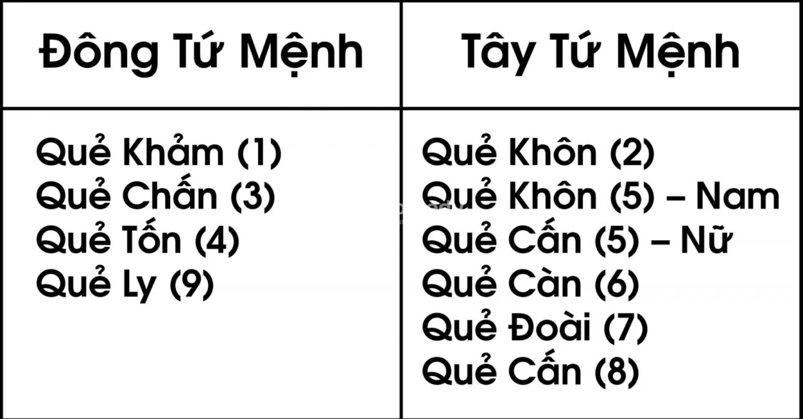 Đông tứ mệnh bao gồm các quẻ Chấn, Tốn, Li, và Khảm, tương ứng với các số hóa 1, 3, 4 và 9. Còn Tây tứ mệnh bao gồm các quẻ Càn, Khôn, Cấn, và Đoài, tương ứng với các số hóa 2, 6, 7, và 8.