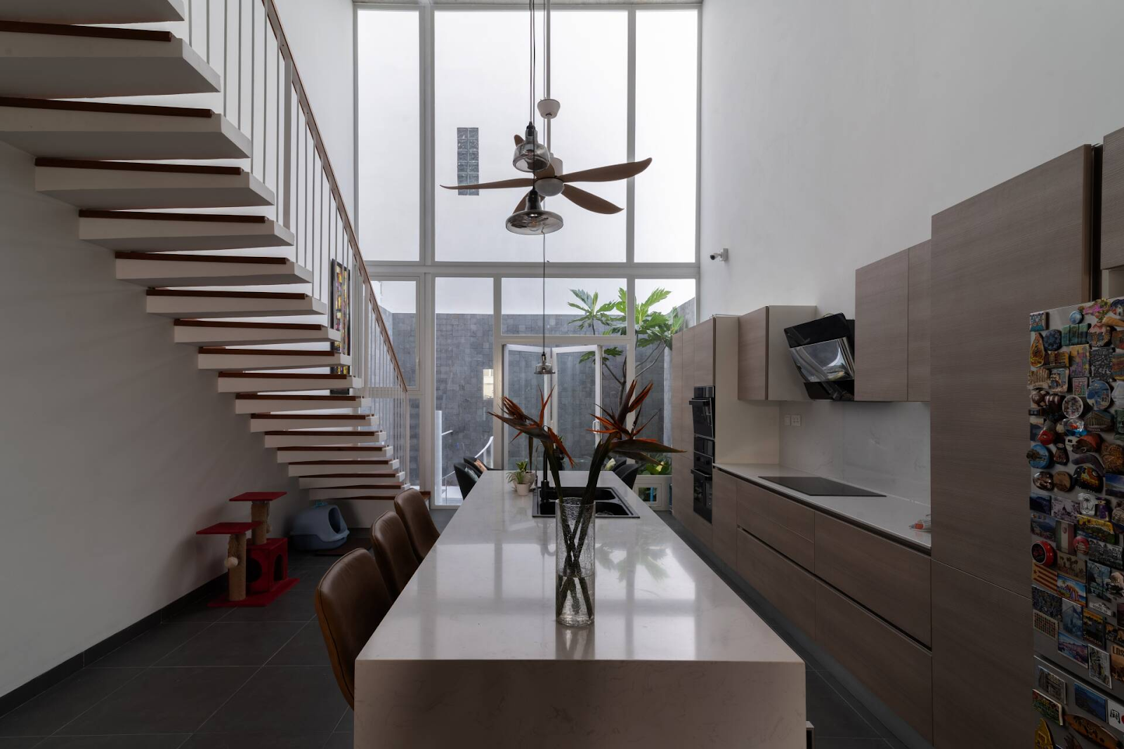 Với những căn nhà có tầng lửng hoặc thiết kế lệch tầng, cầu thang có thể trở thành điểm phân chia tự nhiên giữa bếp và phòng khách. Không cần thêm chi tiết nào phức tạp, chính kiến trúc sẵn có đã tạo nên sự riêng biệt đầy tinh tế.