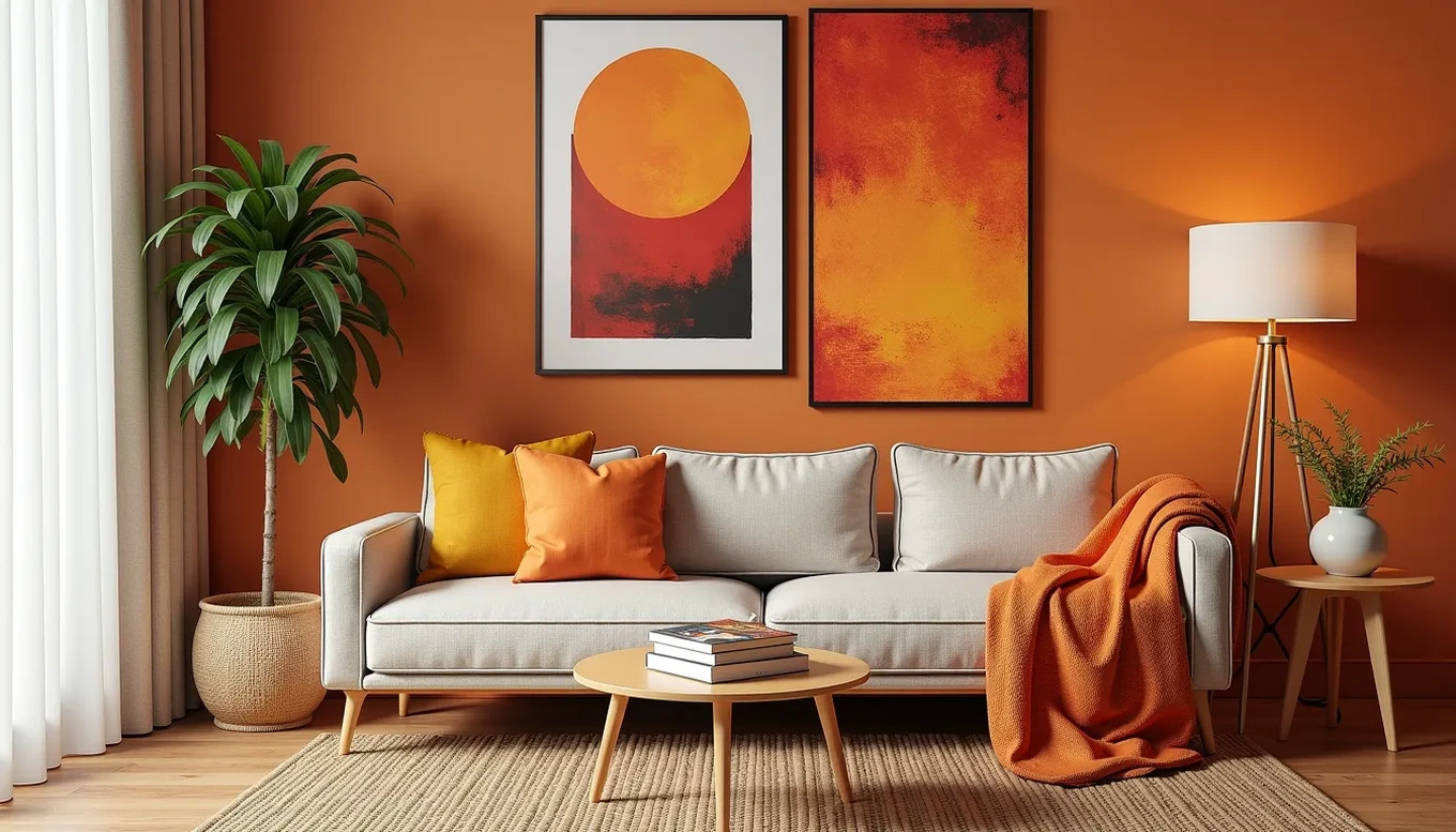 Đỏ rực, cam tươi gây chói mắt, hãy chọn đỏ rượu vang hoặc cam đất để phòng khách ấm và tinh tế hơn.
