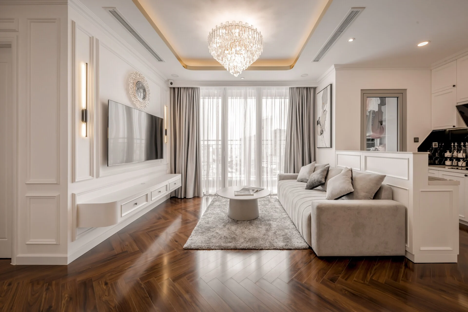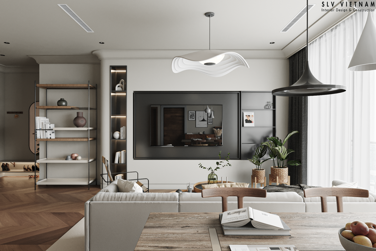 Những đường phào phẳng, tông màu trung tính giúp không gian rộng thoáng và thanh lịch – đặc biệt phù hợp với các căn hộ trẻ trung.