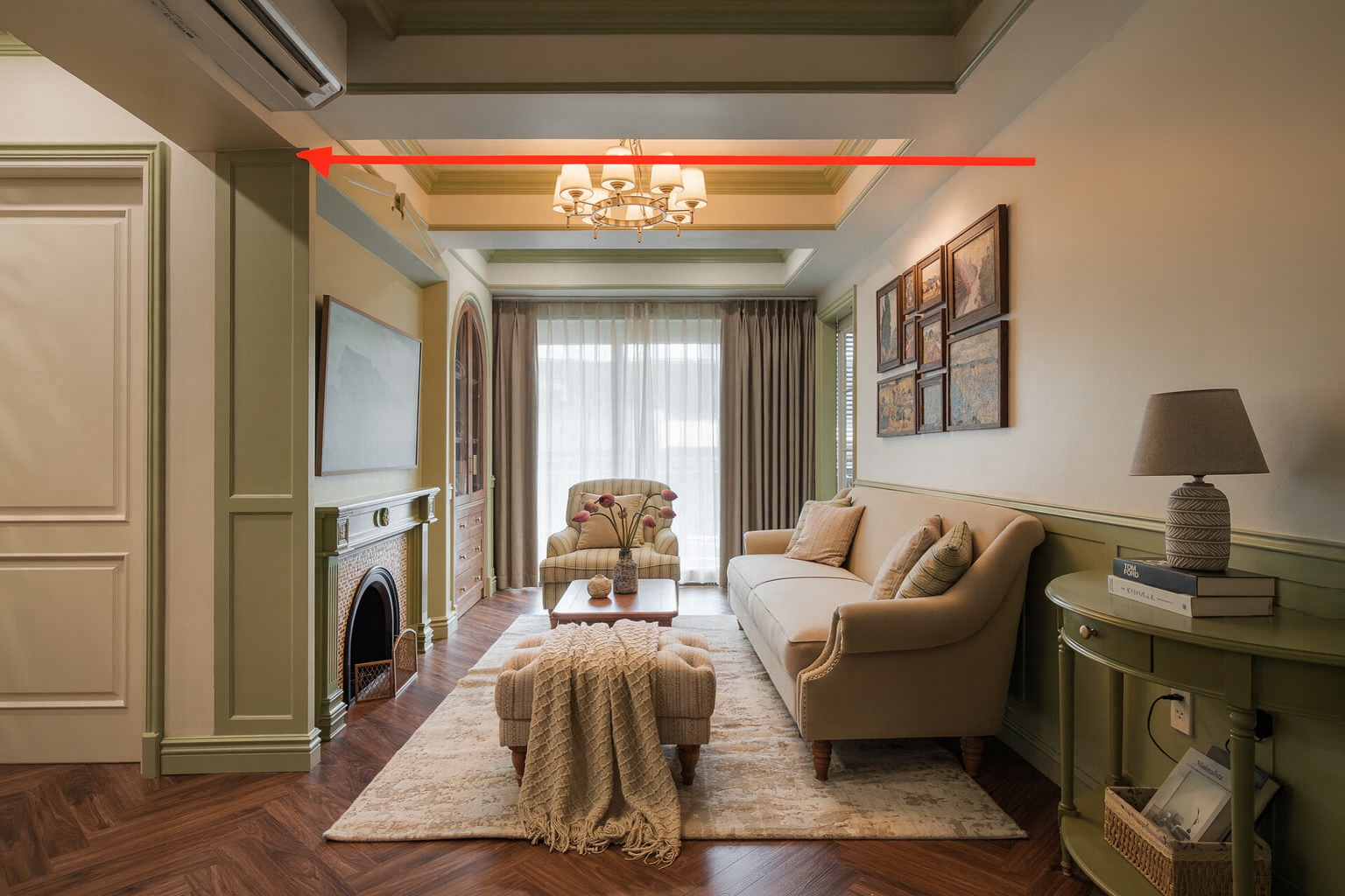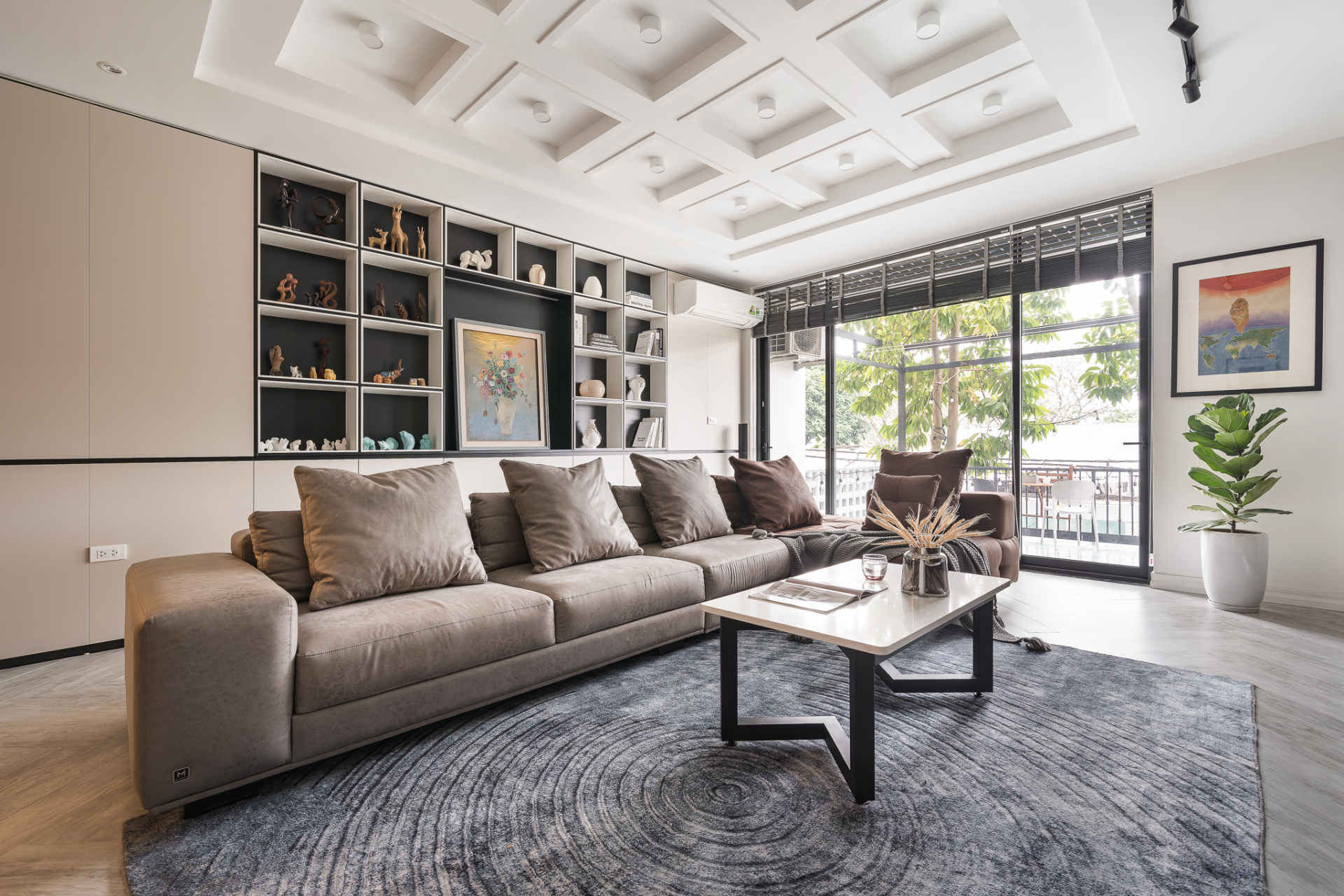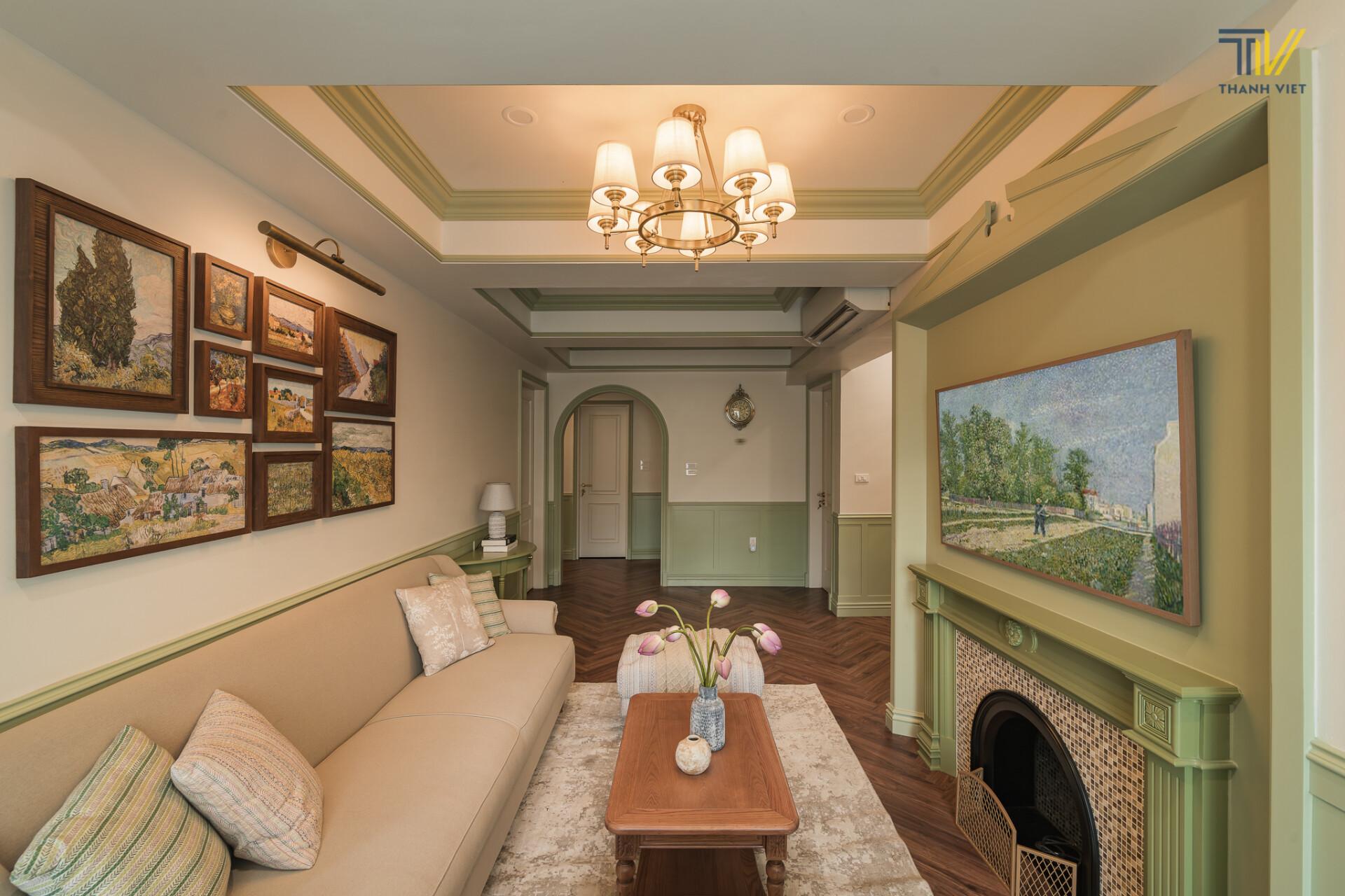 Phào khung lớn giúp tạo điểm nhấn cho mảng tường rộng, đặc biệt lý tưởng đặt sau sofa hoặc khu vực TV.