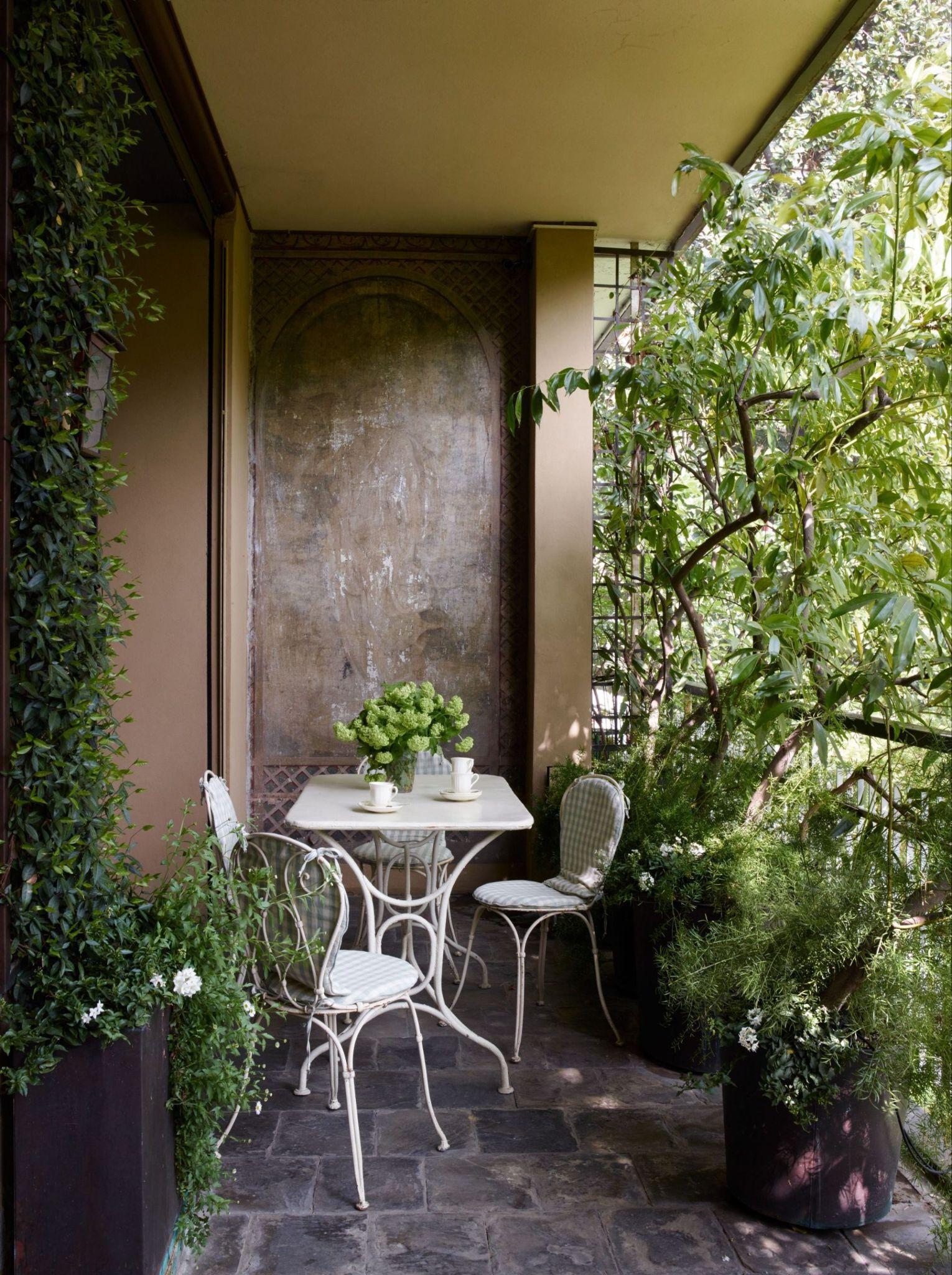 Tại một căn hộ mang phong cách cổ điển ở Milan (Ý), gia chủ đã khéo léo bố trí các lớp cây xanh dày đặc bao quanh lan can. Những tán dương xỉ, cây đuôi công hay dây leo rủ xuống không chỉ che chắn tầm nhìn từ người đi đường mà còn tạo nên hiệu ứng bóng đổ đẹp mắt trên sàn nhà khi nắng lên. Kết hợp cùng bộ bàn ghế sắt uốn nghệ thuật mang hơi hướng vintage, góc nhỏ này bỗng chốc trở thành một khu vườn bí mật đầy chất thơ giữa lòng thành phố.