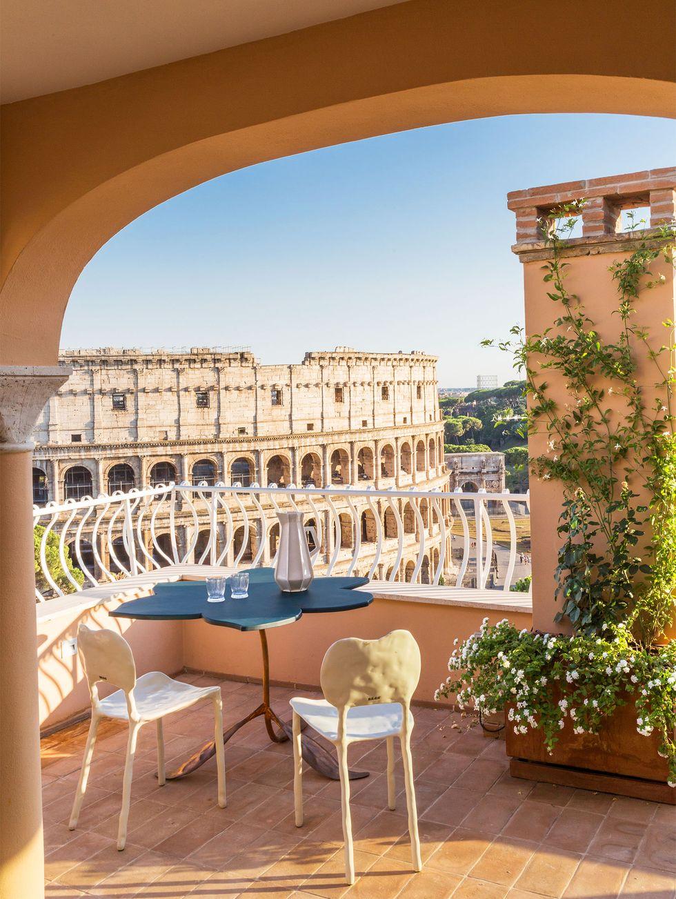 Trong thiết kế của bộ đôi kiến trúc sư Alvisi và Junko Kirimoto, nội thất ban công của một căn hộ áp mái được xoay hướng trực diện ra Đấu trường La Mã. Thay vì ngồi đối diện nhau, ghế ngồi được sắp xếp để mọi người cùng chiêm ngưỡng vẻ đẹp vĩ đại của di sản kiến trúc. Đây là cách tận hưởng xa xỉ nhất mà một ban công có thể mang lại cho người sử dụng.