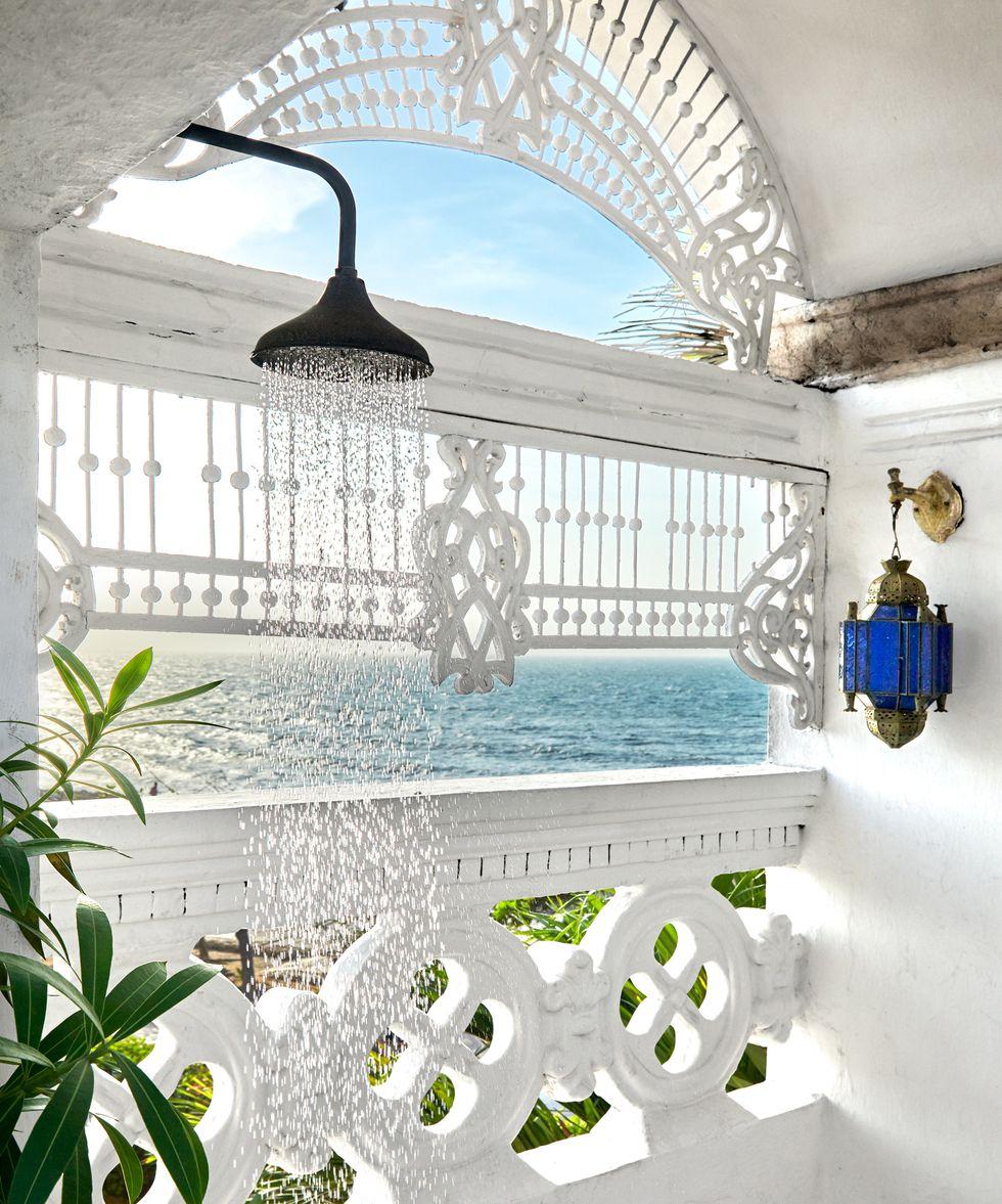 Bạn có thể tham khảo thiết kế từ ngôi nhà ở Colombia, nơi vòi hoa sen bằng đồng thủ công được lắp đặt ngay tại ban công hướng ra biển Caribe. Dưới ánh đèn Ma-rốc lung linh và gió biển mát rượi, việc tắm gội trở thành những giây phút thư giãn xa hoa và độc đáo. Tuy nhiên, khi áp dụng ý tưởng này, hãy lưu ý đến các giải pháp che chắn phù hợp để đảm bảo sự riêng tư cần thiết.