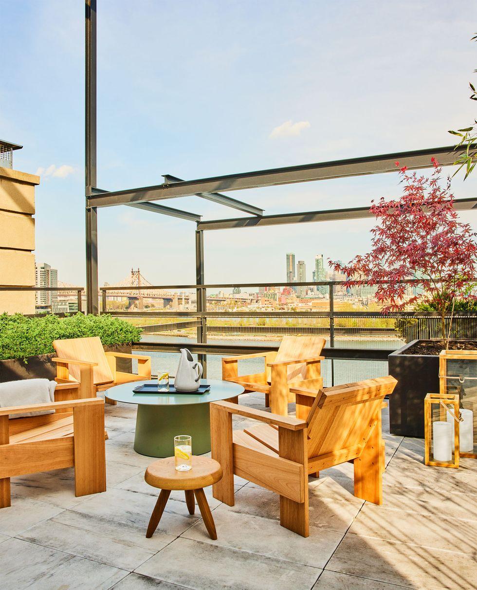 Lấy cảm hứng từ căn hộ áp mái tại Manhattan, bộ đôi kiến trúc sư Christine và John Gachot đã tạo ra một ốc đảo bình yên nhờ nội thất gỗ. Bộ ghế tay vịn chắc chắn, chiếc bàn tròn màu xanh lá cây cùng những chiếc ghế đẩu đa năng đã tạo nên tổng thể hài hòa. Sự hiện diện của chất liệu gỗ giúp không gian ngoài trời trở nên ấm cúng, sang trọng hơn bao giờ hết.