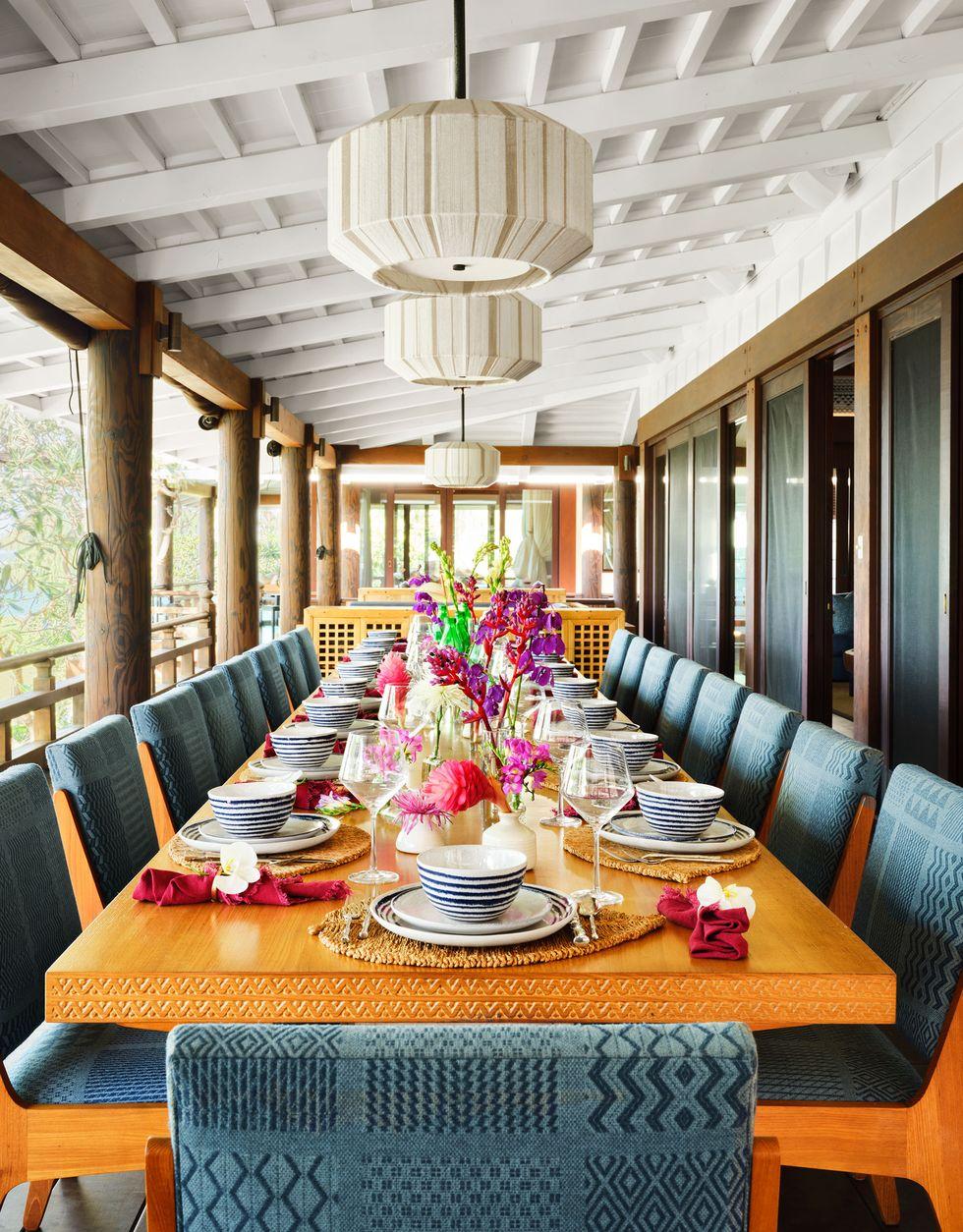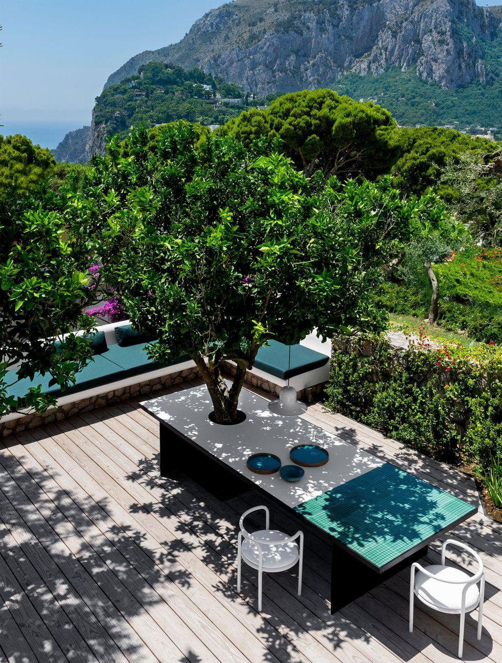 Tại ngôi nhà của chủ chuỗi nhà hàng ở Capri, kiến trúc sư đã có một giải pháp đầy sáng tạo: sử dụng chiếc bàn dài đục lỗ để thân cây có thể phát triển xuyên qua. Cách làm này vừa bảo tồn được hệ thực vật vốn có, vừa tận dụng được bóng mát tự nhiên để làm nơi sinh hoạt. Sự cộng sinh giữa con người và thiên nhiên chính là đỉnh cao của nghệ thuật bài trí ban công bền vững.